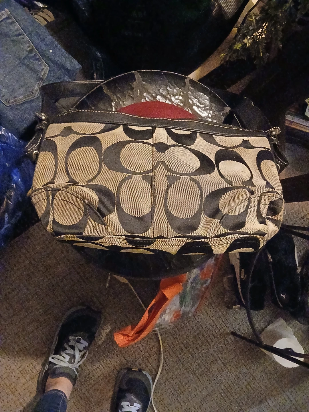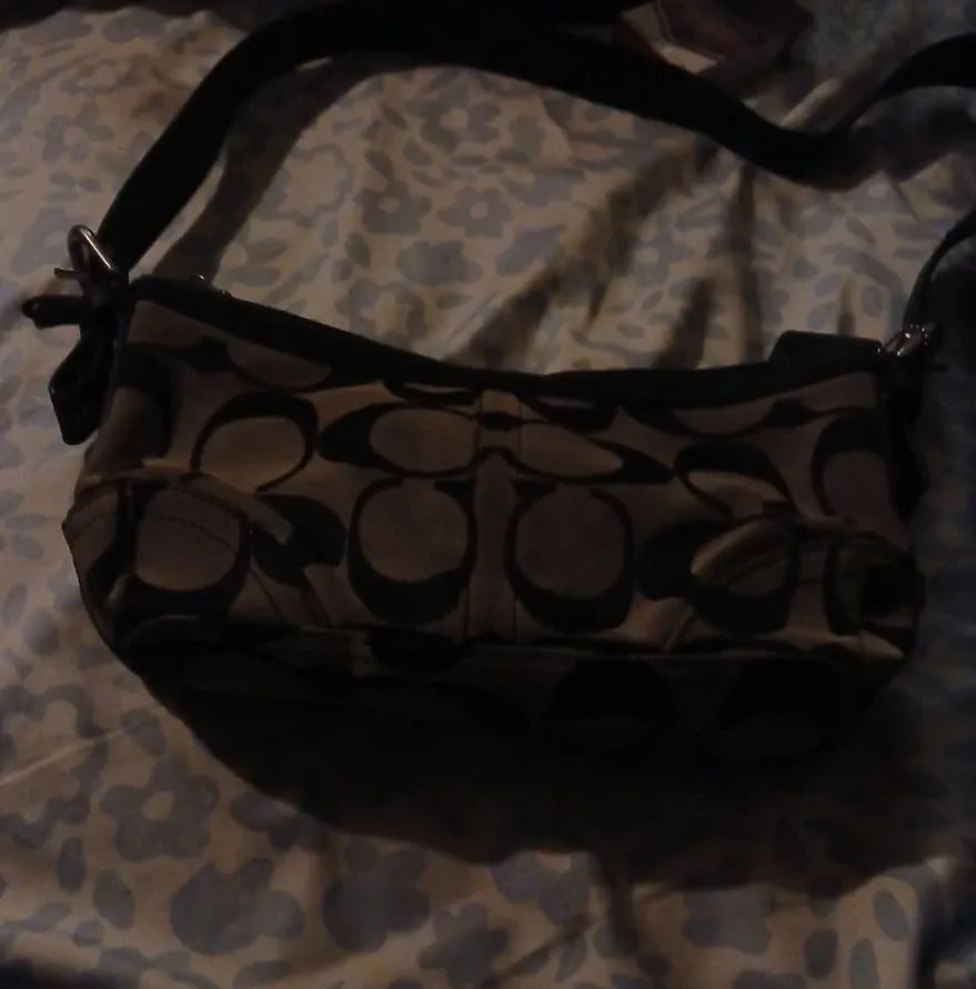 This is a Coach shoulder bag featuring the signature C pattern. It has a black strap and trim. It's a stylish accessory for everyday use.