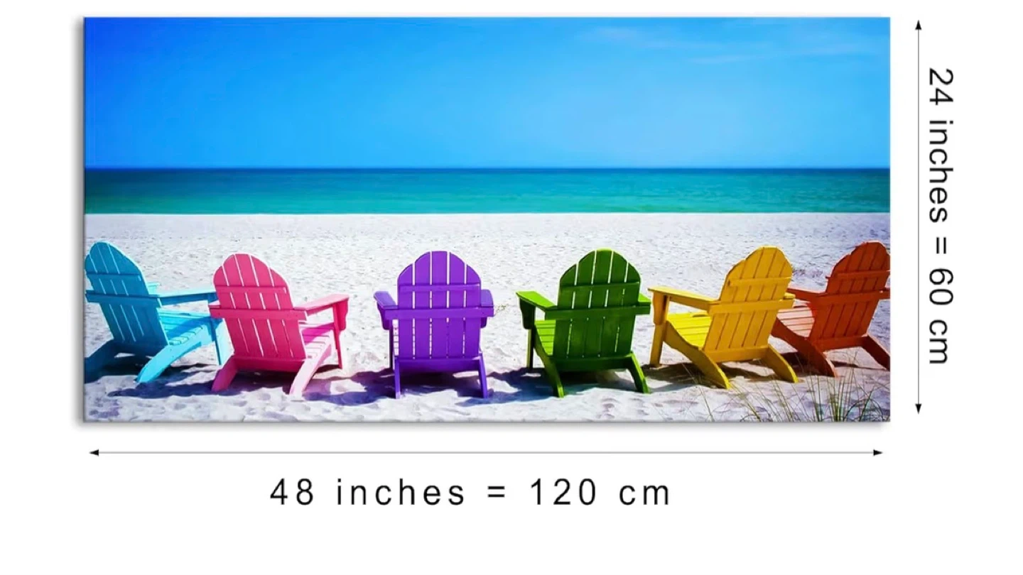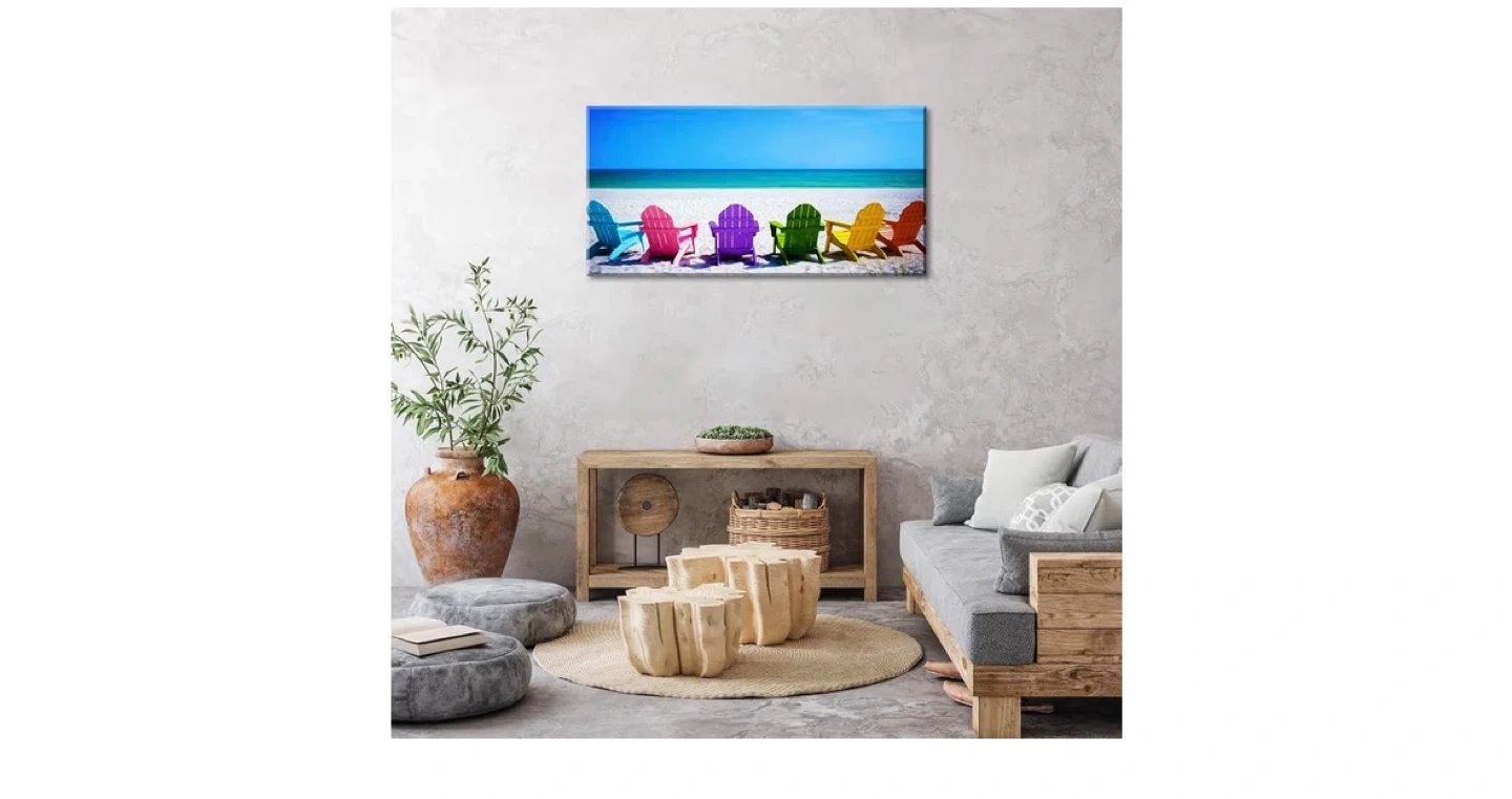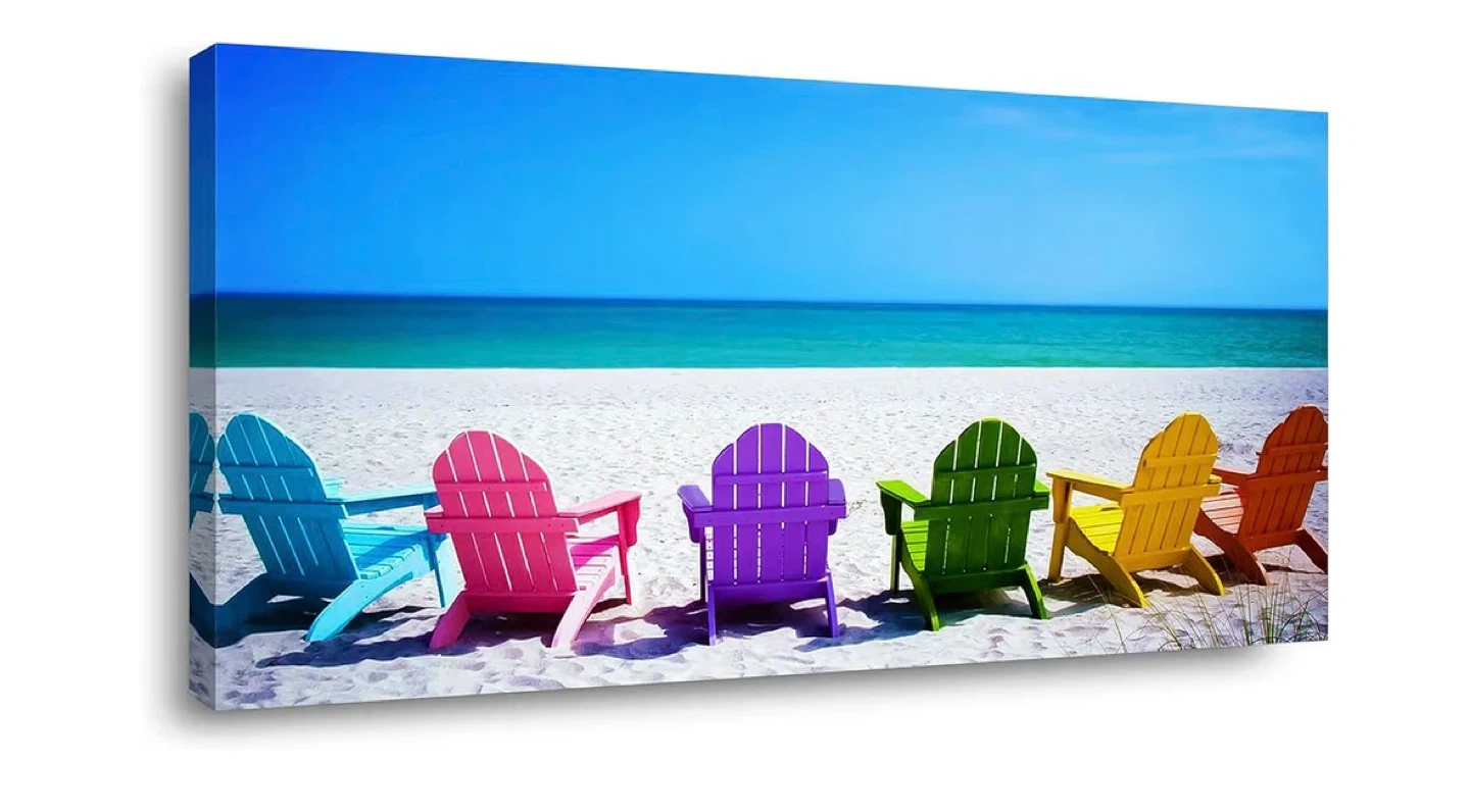 Canvas wall art featuring a row of colourful Adirondack chairs on a sandy beach with a bright blue ocean and sky. This landscape print is 48 inches wide by 24 inches tall. It's a vibrant piece that brings a coastal feel to any room!