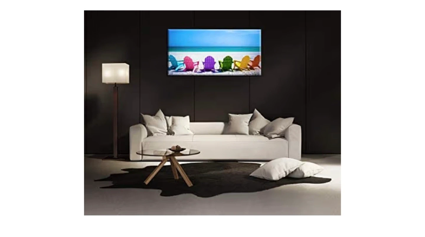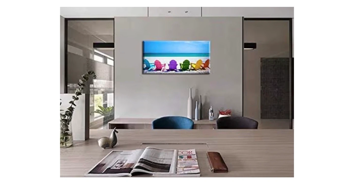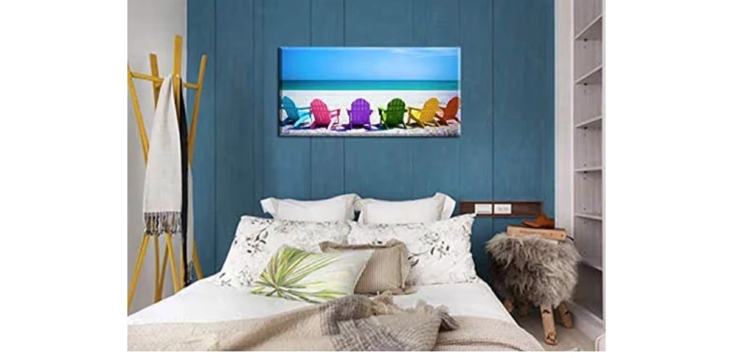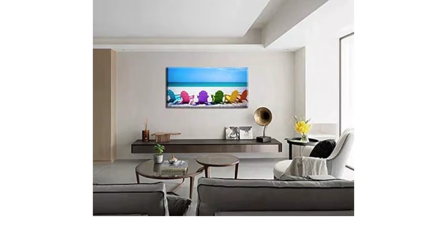 Canvas wall art featuring a row of colourful Adirondack chairs on a sandy beach with a bright blue ocean and sky. This landscape print is 48 inches wide by 24 inches tall. It's a vibrant piece that brings a coastal feel to any room!