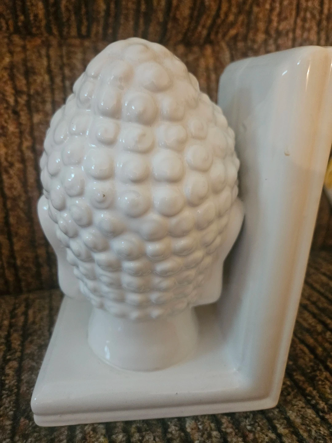 This white ceramic bookend features a detailed Buddha head design. It's made of ceramic material. This item is sold individually.