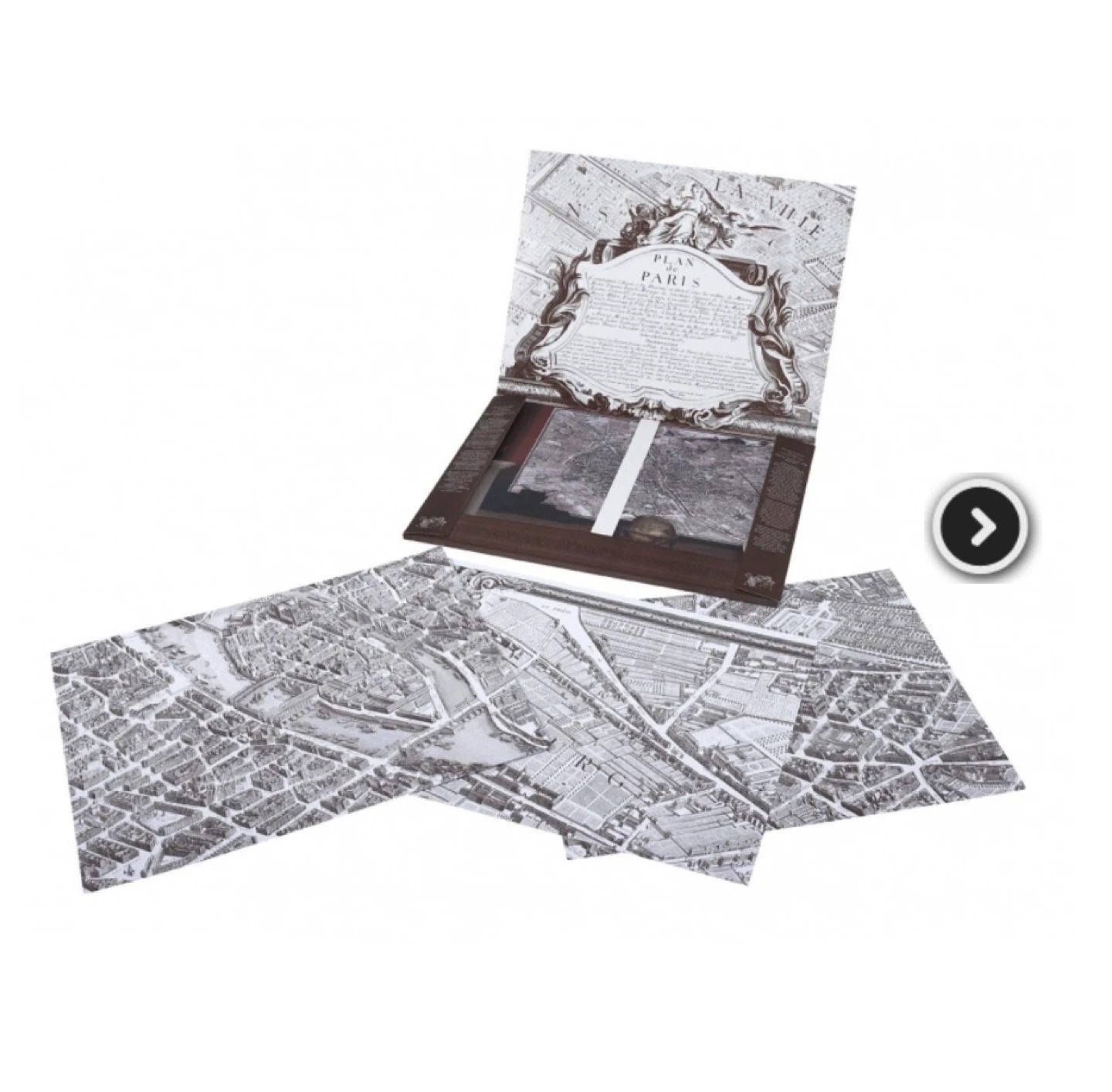 Beautiful reproduction portfolio of the 1739 “Plan de Paris” (Turgot Map) — a highly detailed historic map of Paris presented in multiple large-format sheets.
