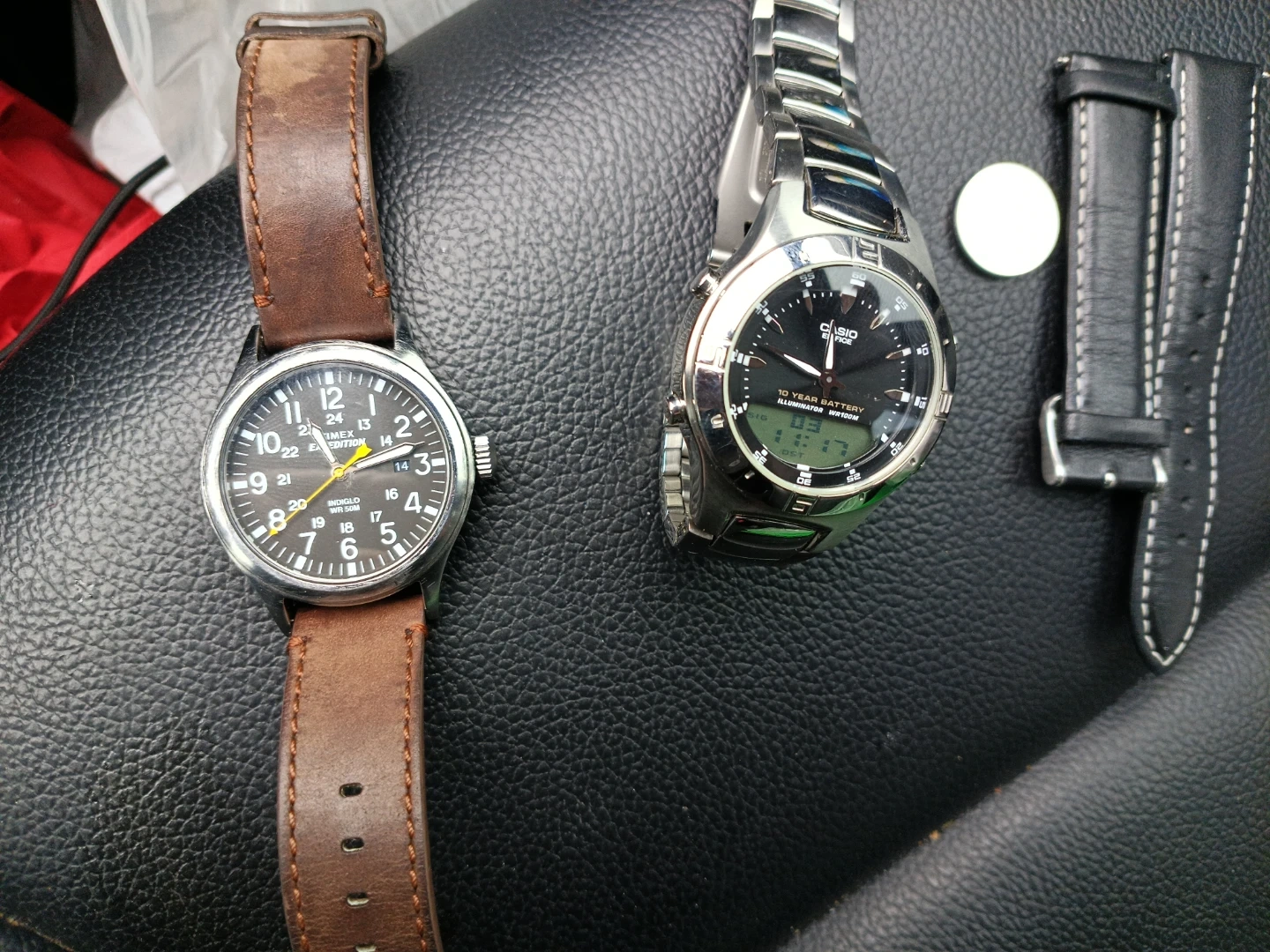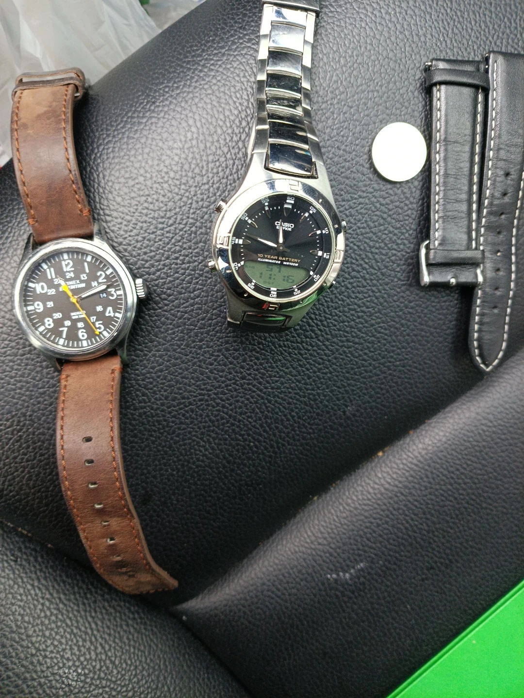 Two watches included: one Casio with a metal band and a black leather strap, and another watch with a brown leather strap. The Casio watch boasts a 10-year battery and illumination. Extra black strap also included,plus extra battery for Casio and second watch Timex expedition both watch everything one price