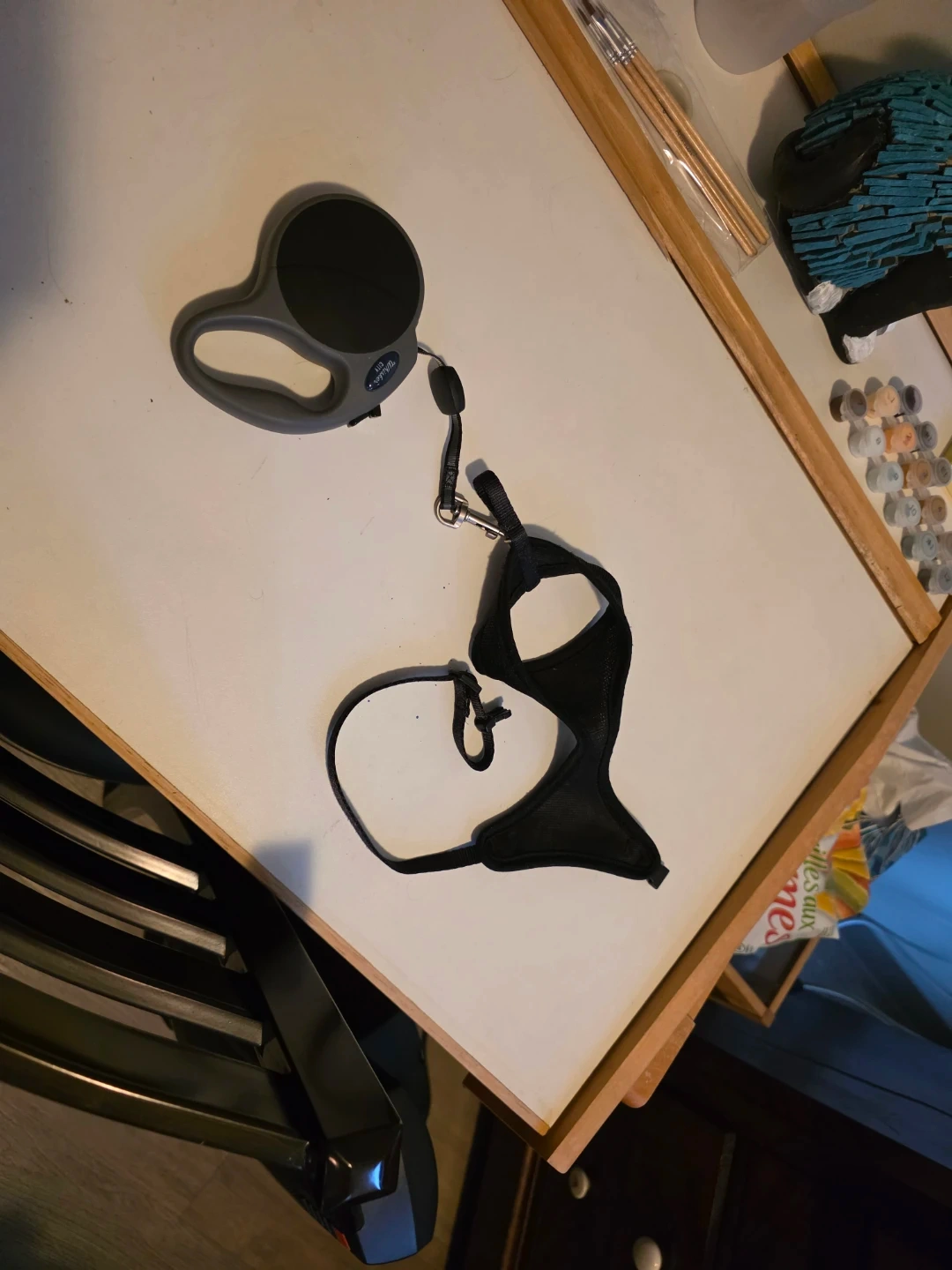 This is a grey retractable dog leash, paired with a black mesh dog harness. The leash extends for freedom of movement. It's suitable for small to medium-sized dogs.
