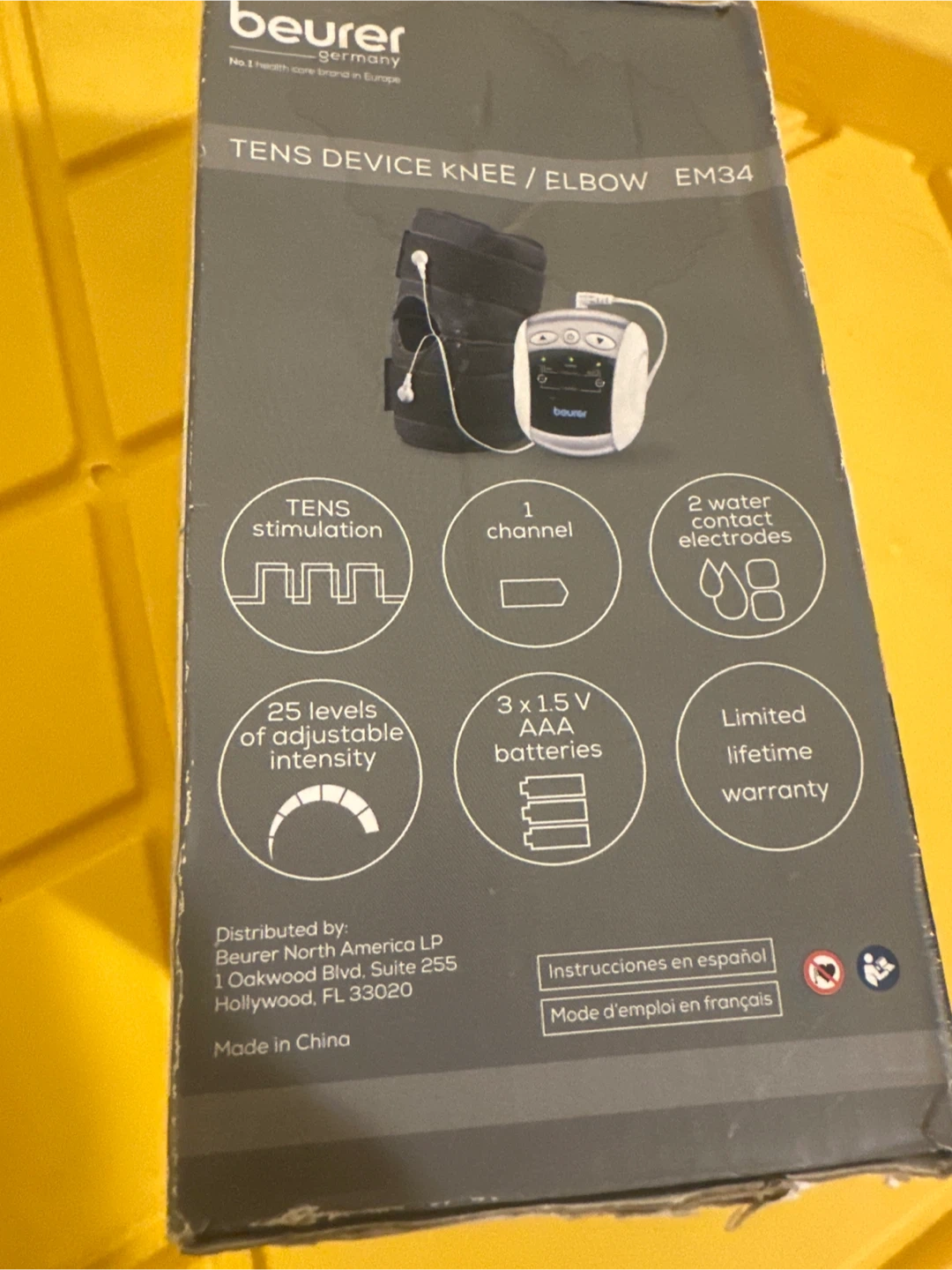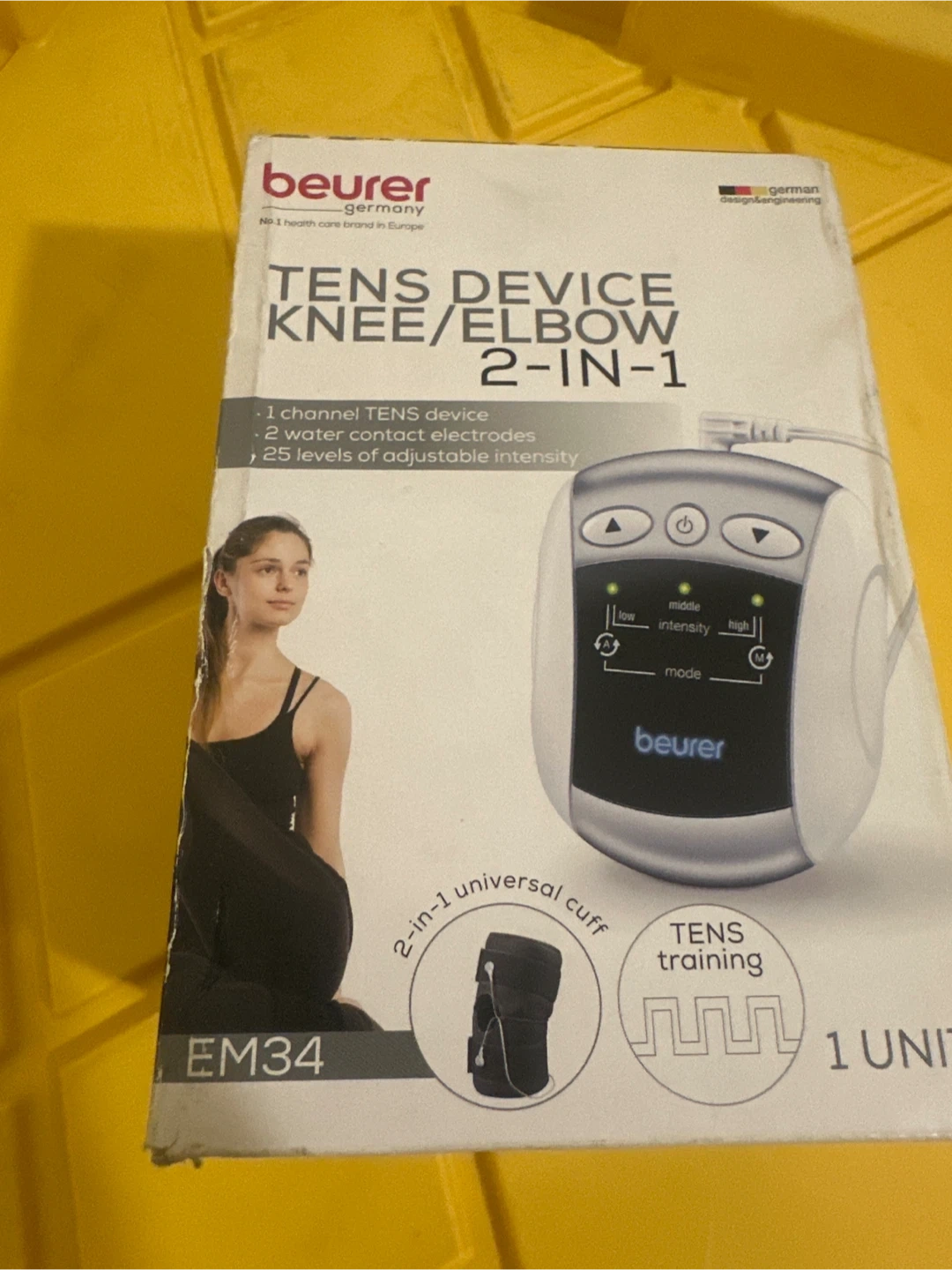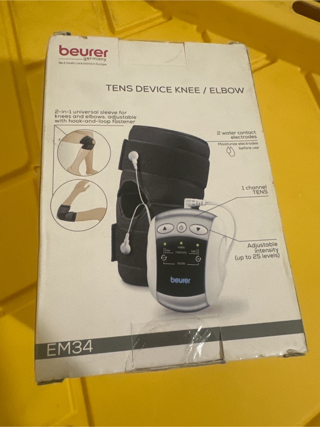 This Beurer EM34 is a 2-in-1 universal sleeve TENS device for knees and elbows. It features 1 channel for TENS stimulation, 2 water contact electrodes, and 25 levels of adjustable intensity. It's powered by 3 x 1.5V AAA batteries.