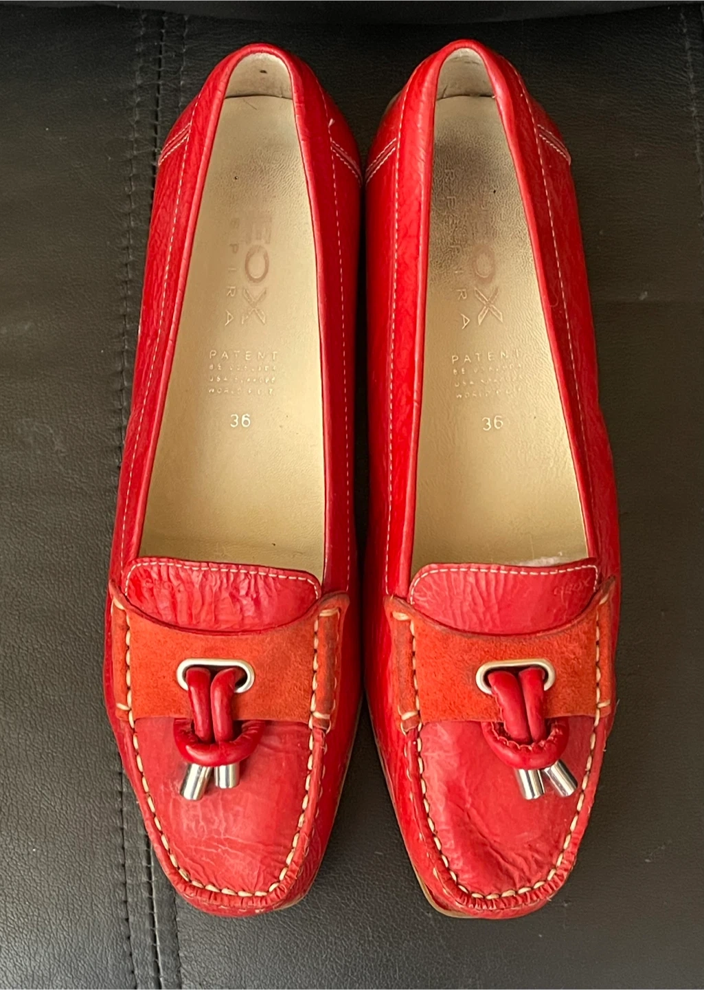 Geox leather loafers in red. Size is 36. They're a slip-on style with decorative knot detail. These shoes are great for everyday wear! Very good condition.