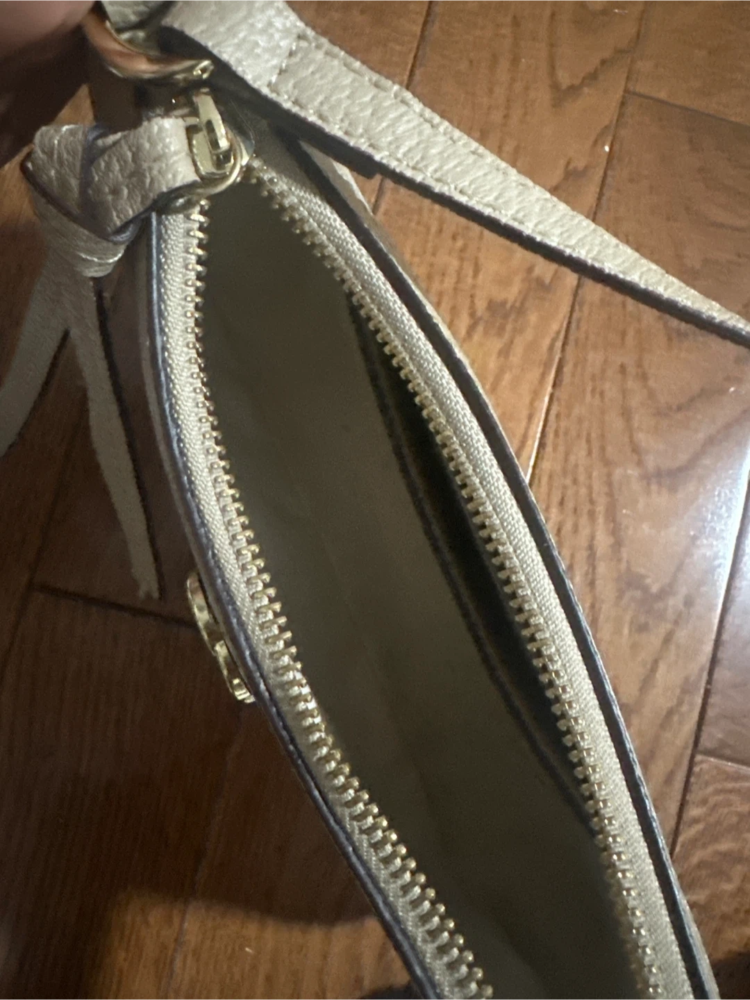 A beige and white Gucci shoulder bag with the signature GG monogram pattern. It features a top zipper closure and a single strap. This bag is perfect for everyday use. can meet whitby, oshawa, bowmanville or scarborough