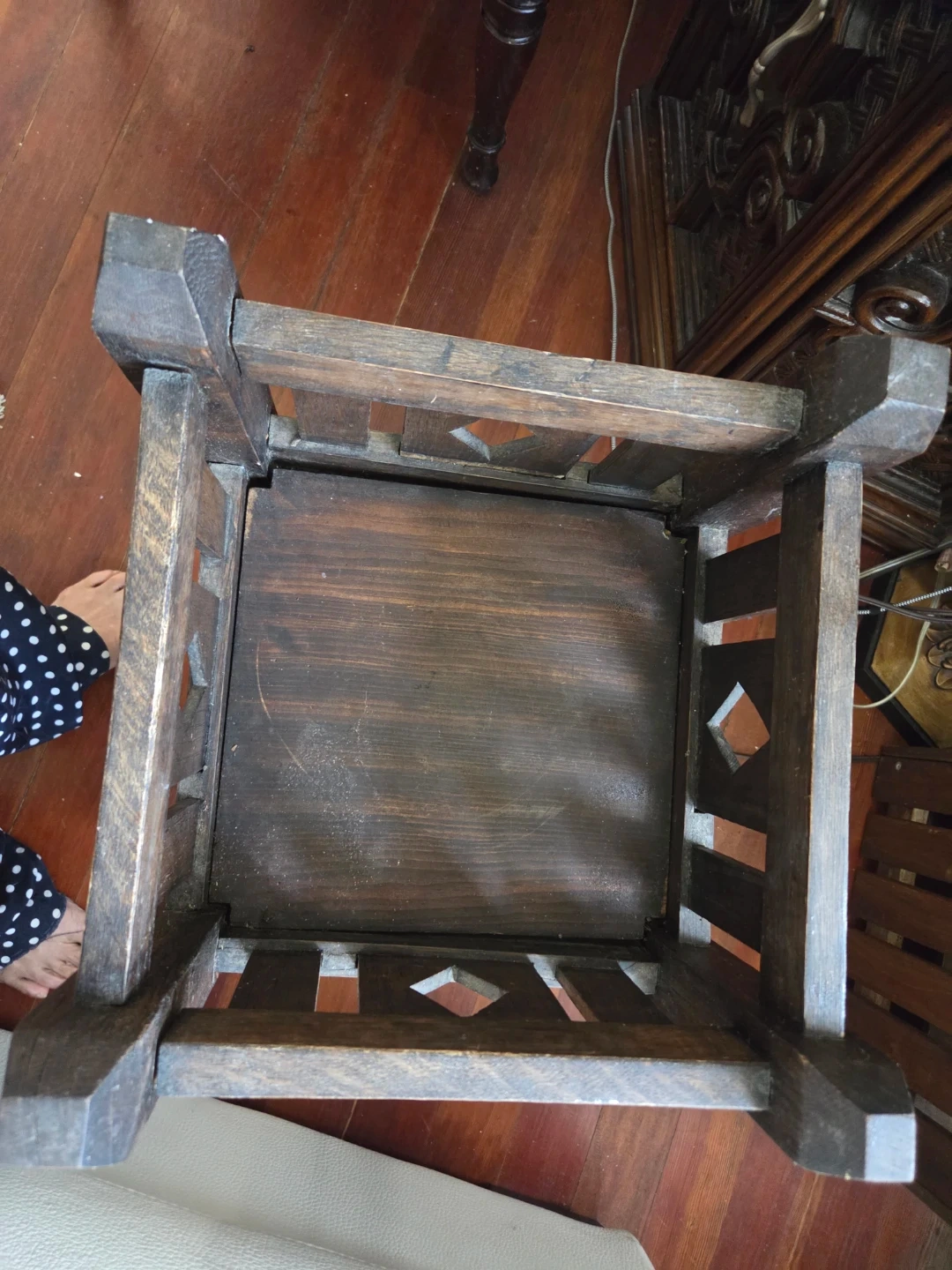 This is a sturdy wooden plant stand or small stool. It's made of dark-stained wood with decorative cutouts. It would look great holding a potted plant or as an extra seat.