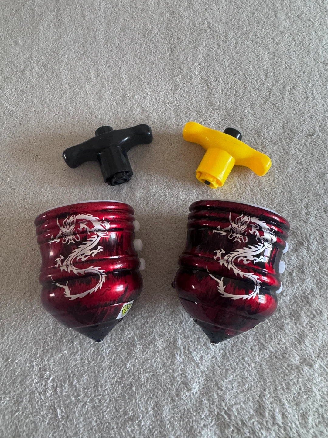 Two spinning tops with a red and black dragon design. Includes one black and one yellow T-shaped launcher. Great for Beyblade battles!