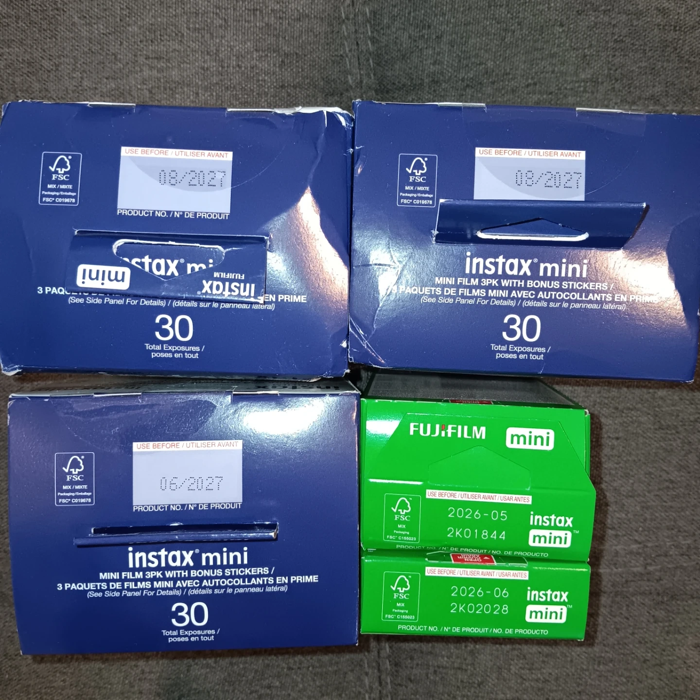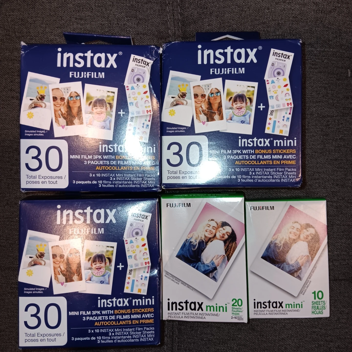 12 x 10 packs of Fujifilm Instax Mini instant film. Total exposures vary by pack, with options for 20 or 30 photos per pack. Some packs have expiry dates up to 2027.