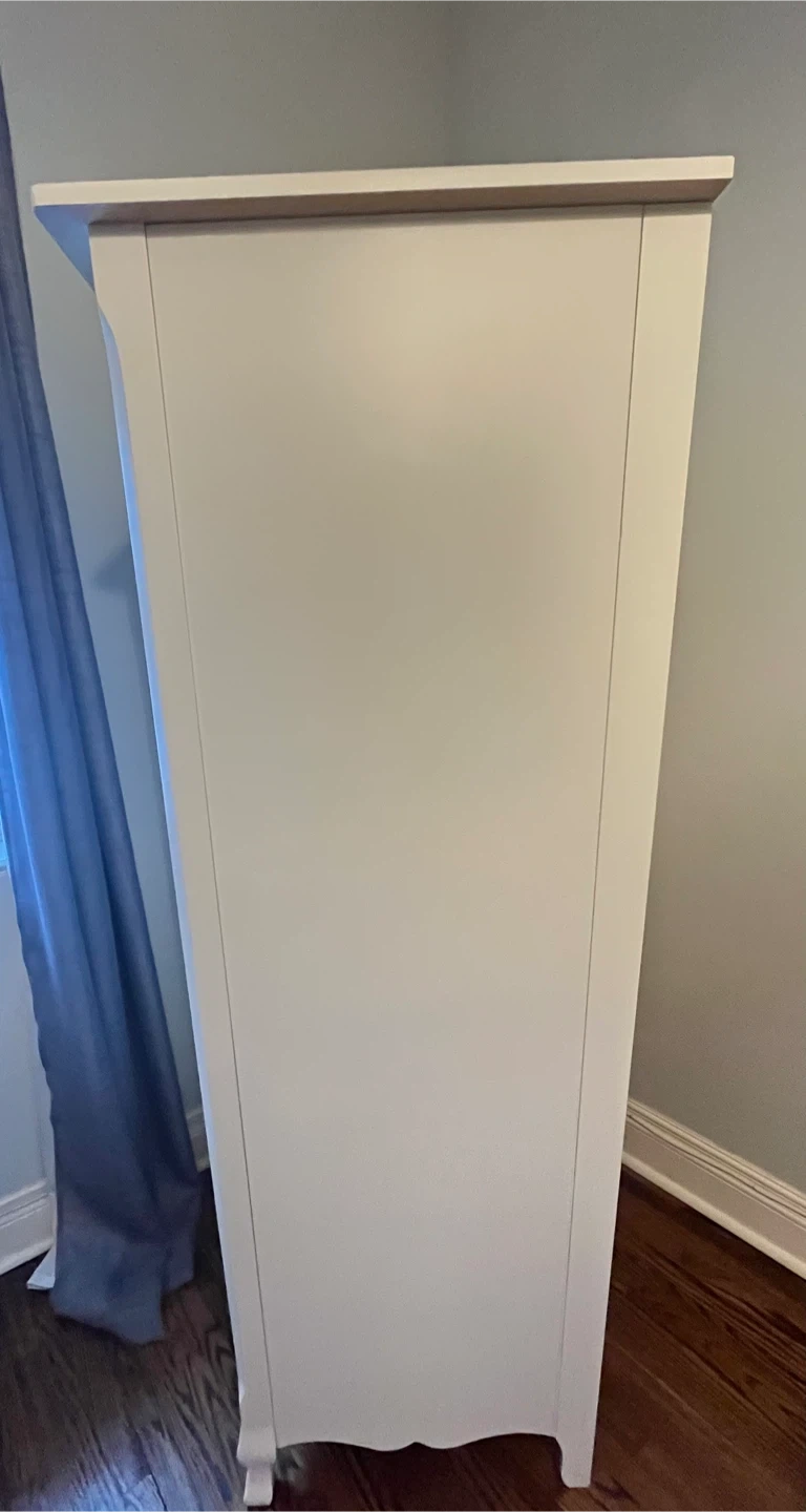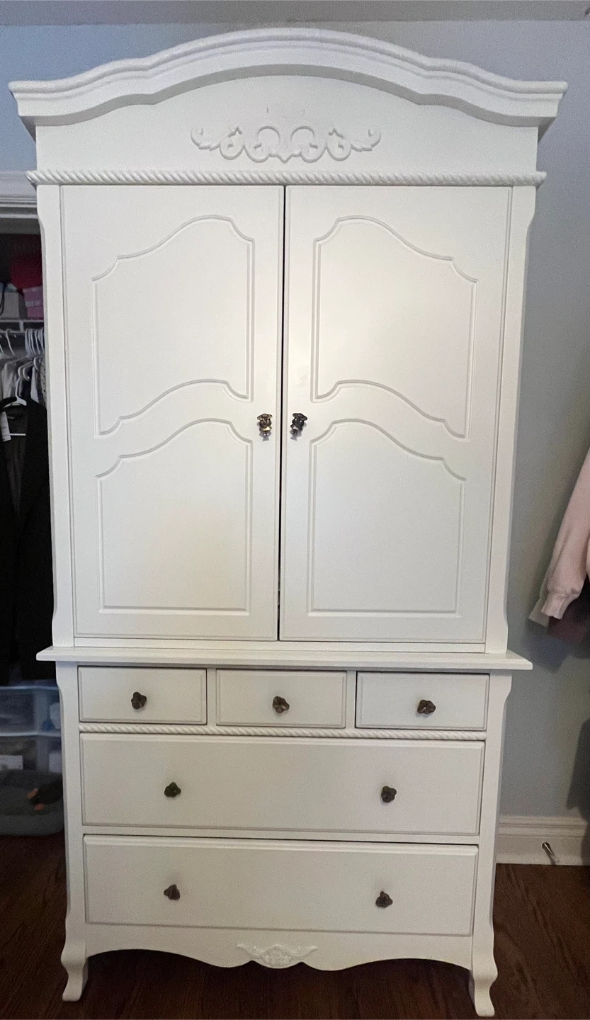 Antique white tall dresser and armoire from Natart Juvenile, a division of Natart Furniture. Would complement any juniors bedroom. The tall dresser has seven drawers with decorative floral pulls. Measures 60 ”Hx30”Dx21”D