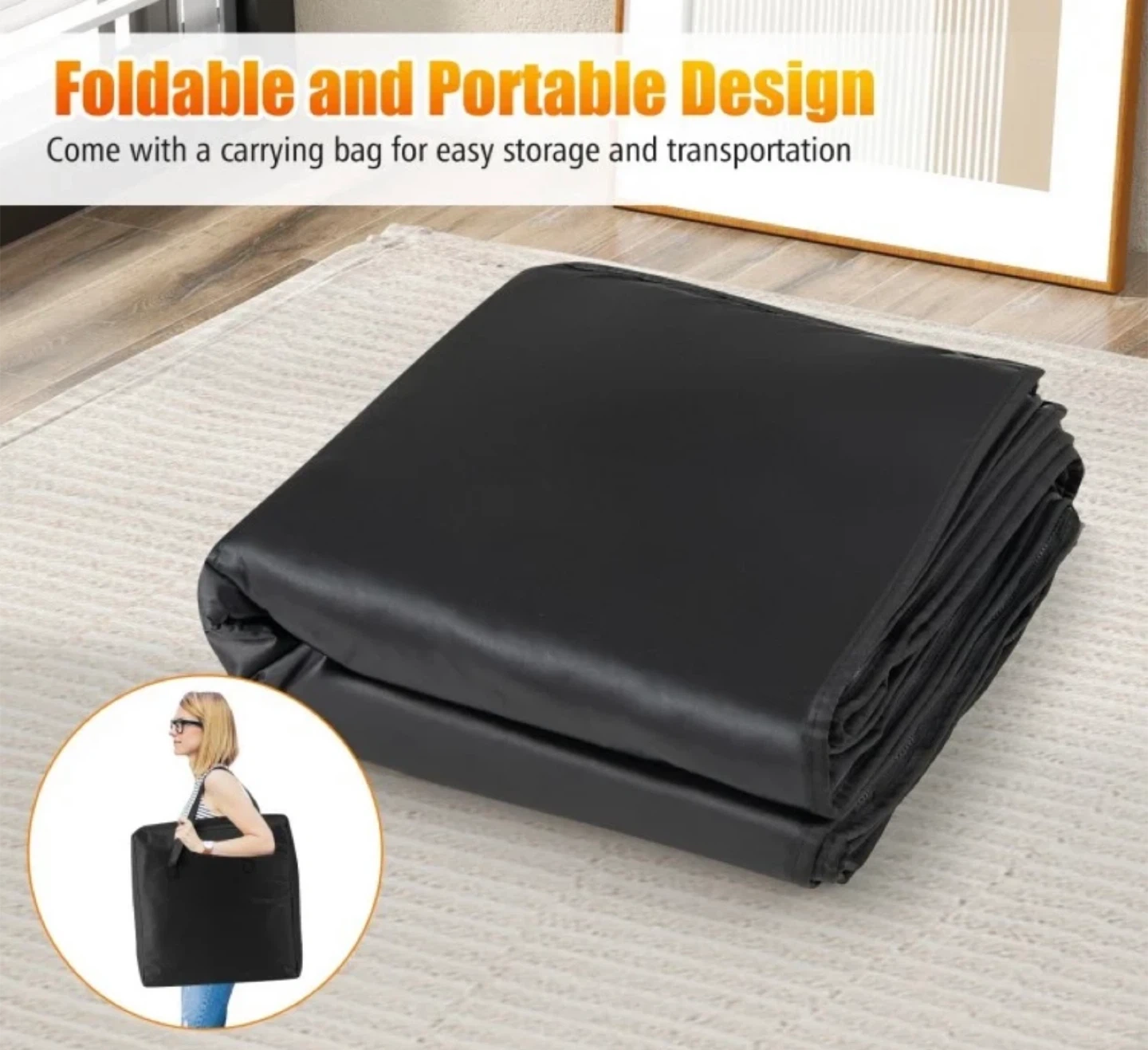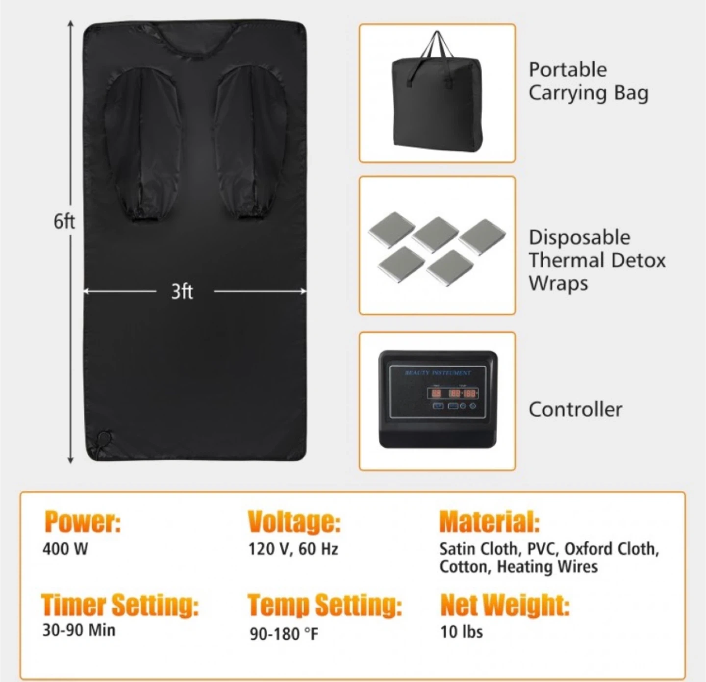 This portable infrared sauna blanket comes with a convenient controller and a carrying bag. It's made from satin cloth, PVC, Oxford cloth, and cotton with heating wires. The timer settings range from 30-90 minutes and temperature from 90-180°F.