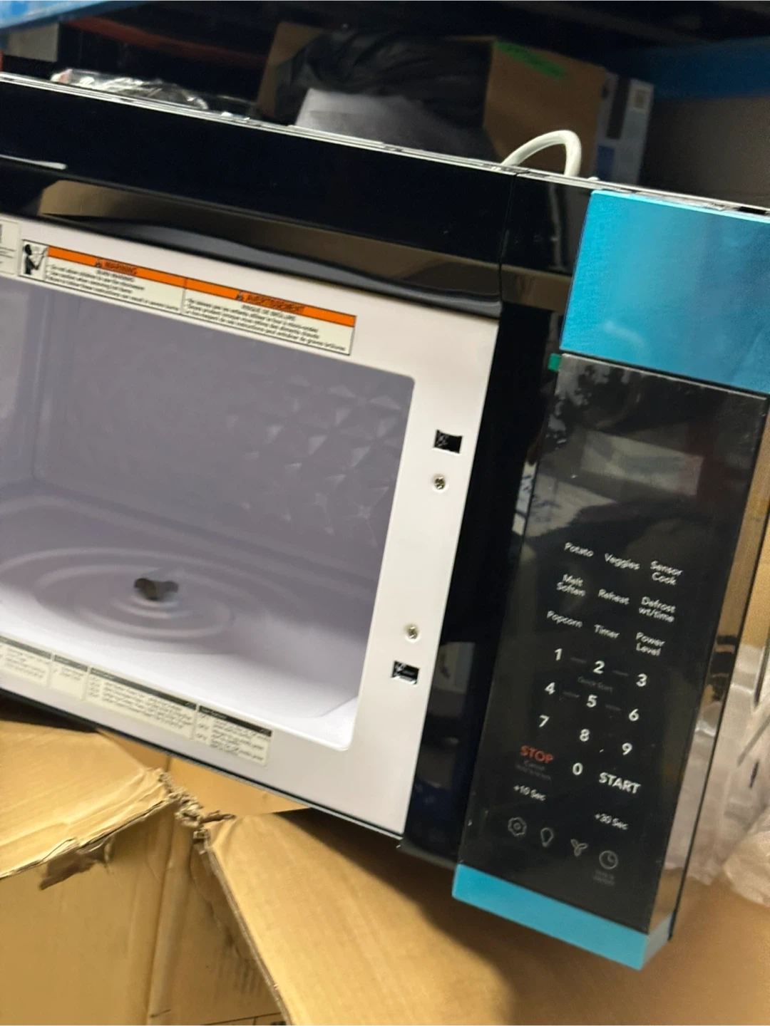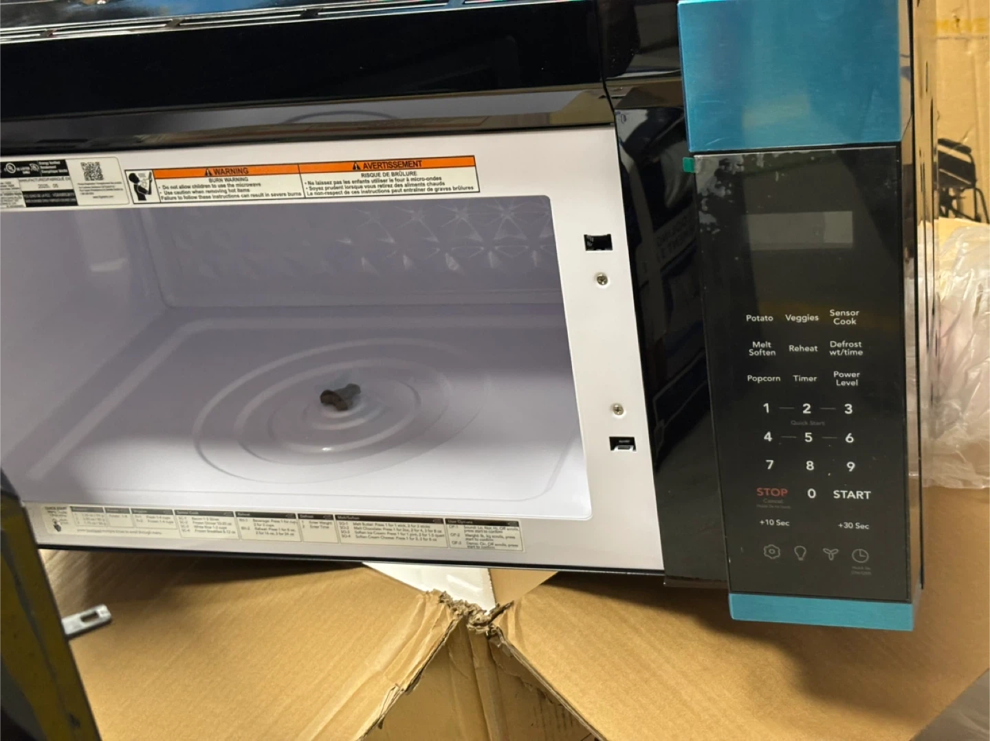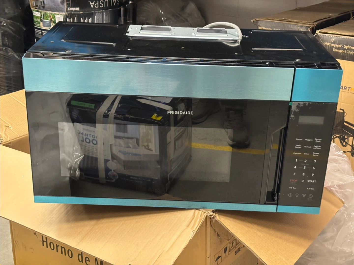 This is a new Frigidaire microwave oven. It features a glass turntable and comes with an over-the-range mounting kit. Pre-programmed settings include popcorn, potato, and sensor cook.