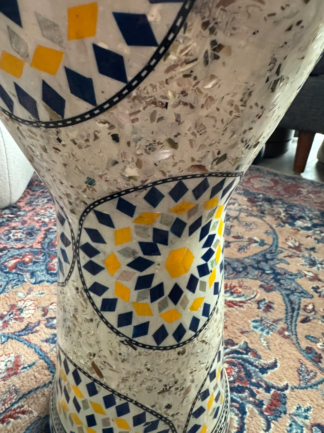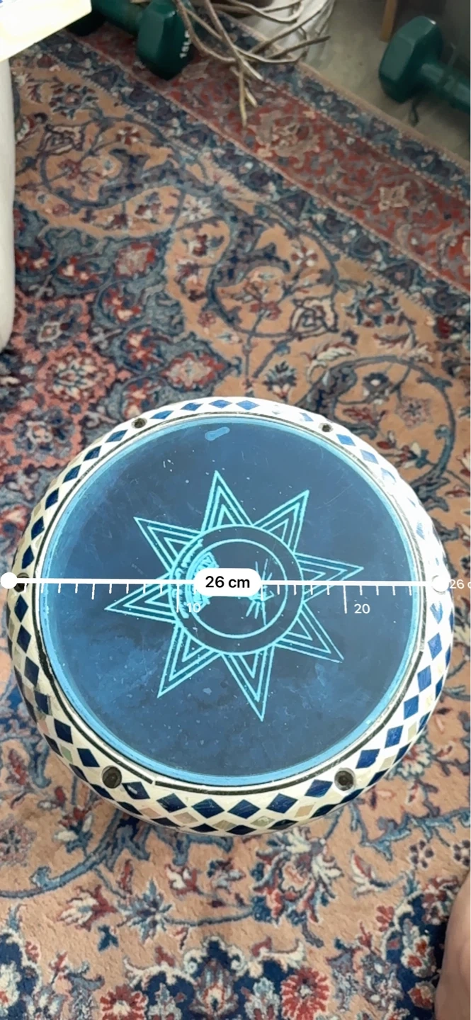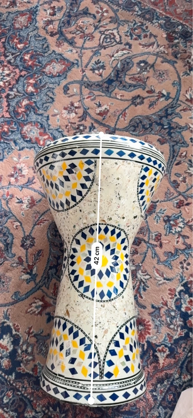 This decorative drum features a colourful mosaic design with blue, yellow, and silver tiles. It measures 42 cm in height and 26 cm in diameter. It's a unique piece for home decor or as a musical instrument if you’re willing to learn.