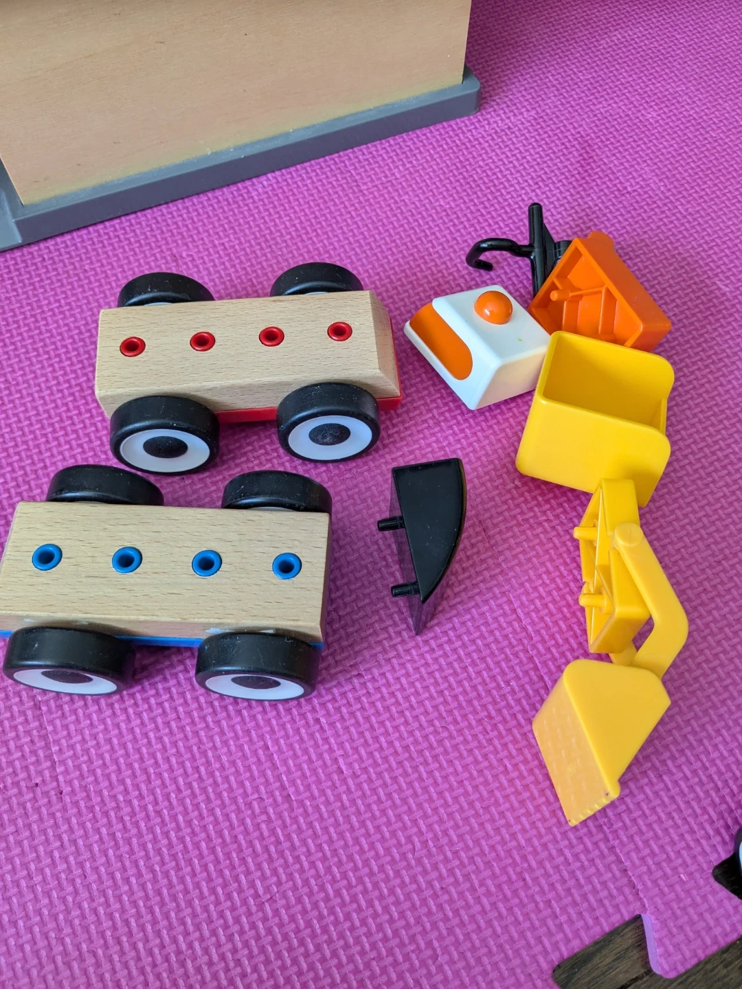 This IKEA wooden toy set includes multiple construction vehicles like a crane, bulldozer, and trucks. It also comes with a multi-level garage. It's made of wood with some plastic elements.
