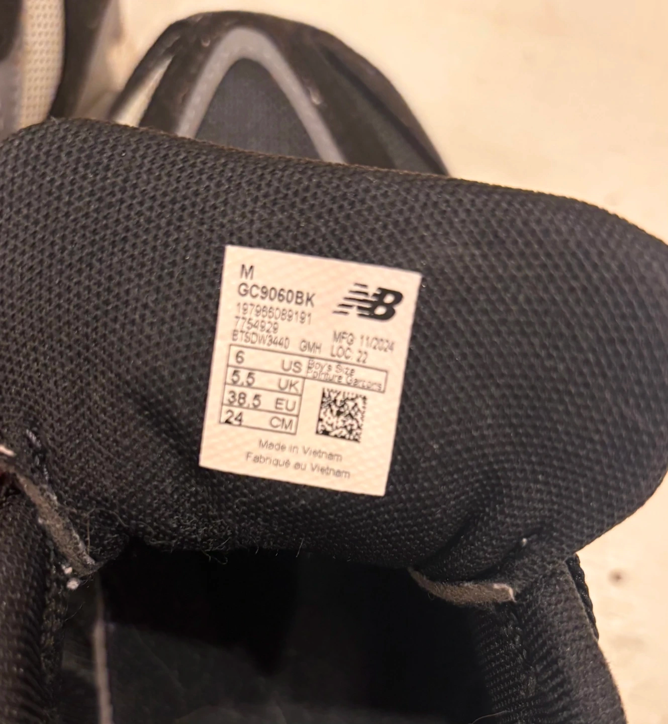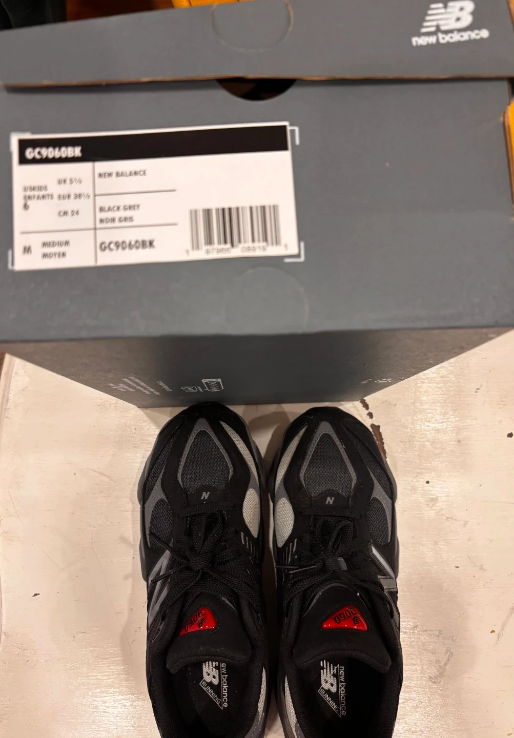 New Balance GC9060BK running shoes in black and grey. Youth size 6, with EUR 38.5 and CM 24. Includes original box.