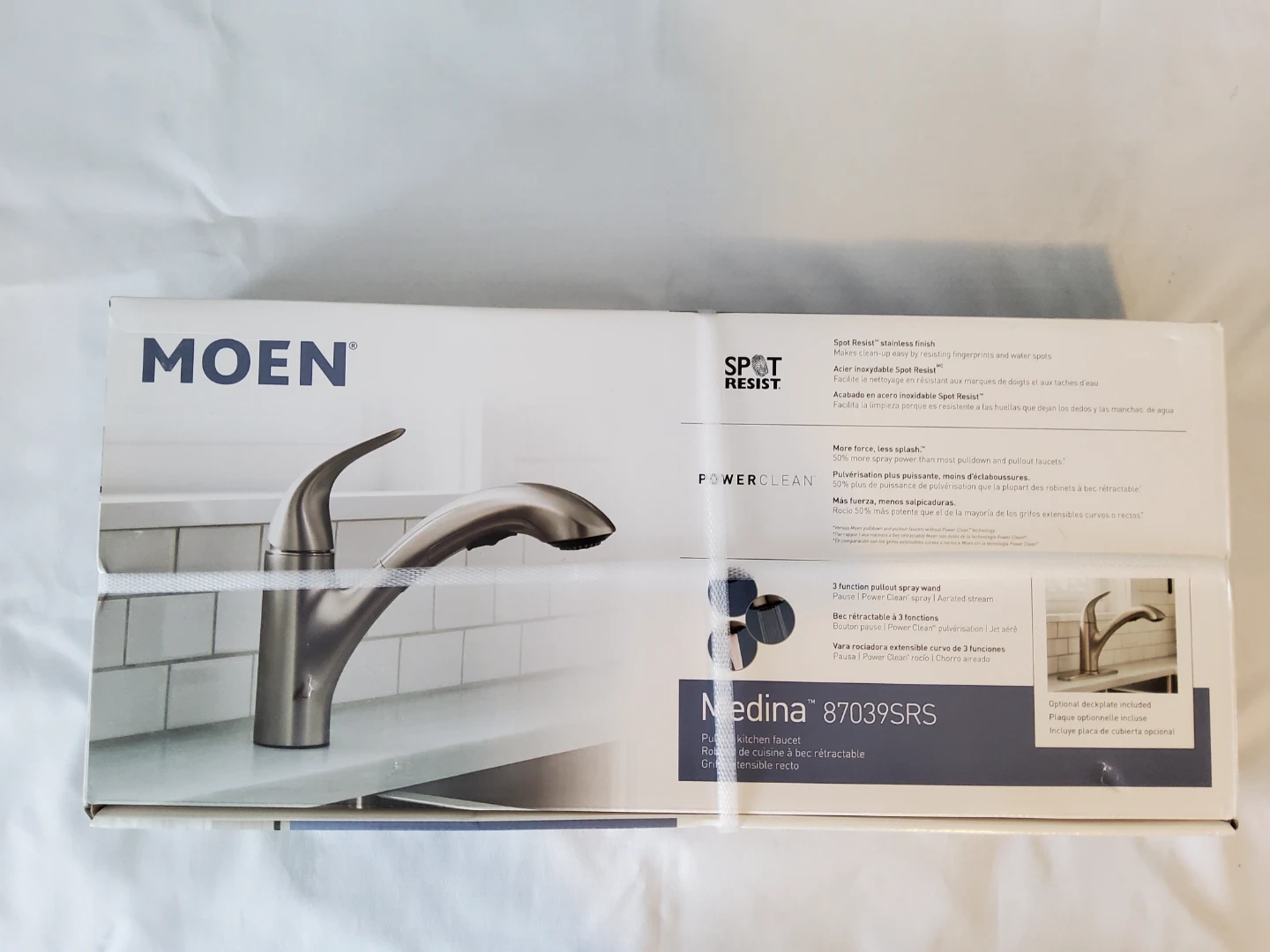 This is a Moen Medina 87039SRS pullout kitchen faucet in a Spot Resist stainless finish. It features a 3-function pullout spray wand with Pause, Power Clean spray, and Aerated stream options. An optional deckplate is included.