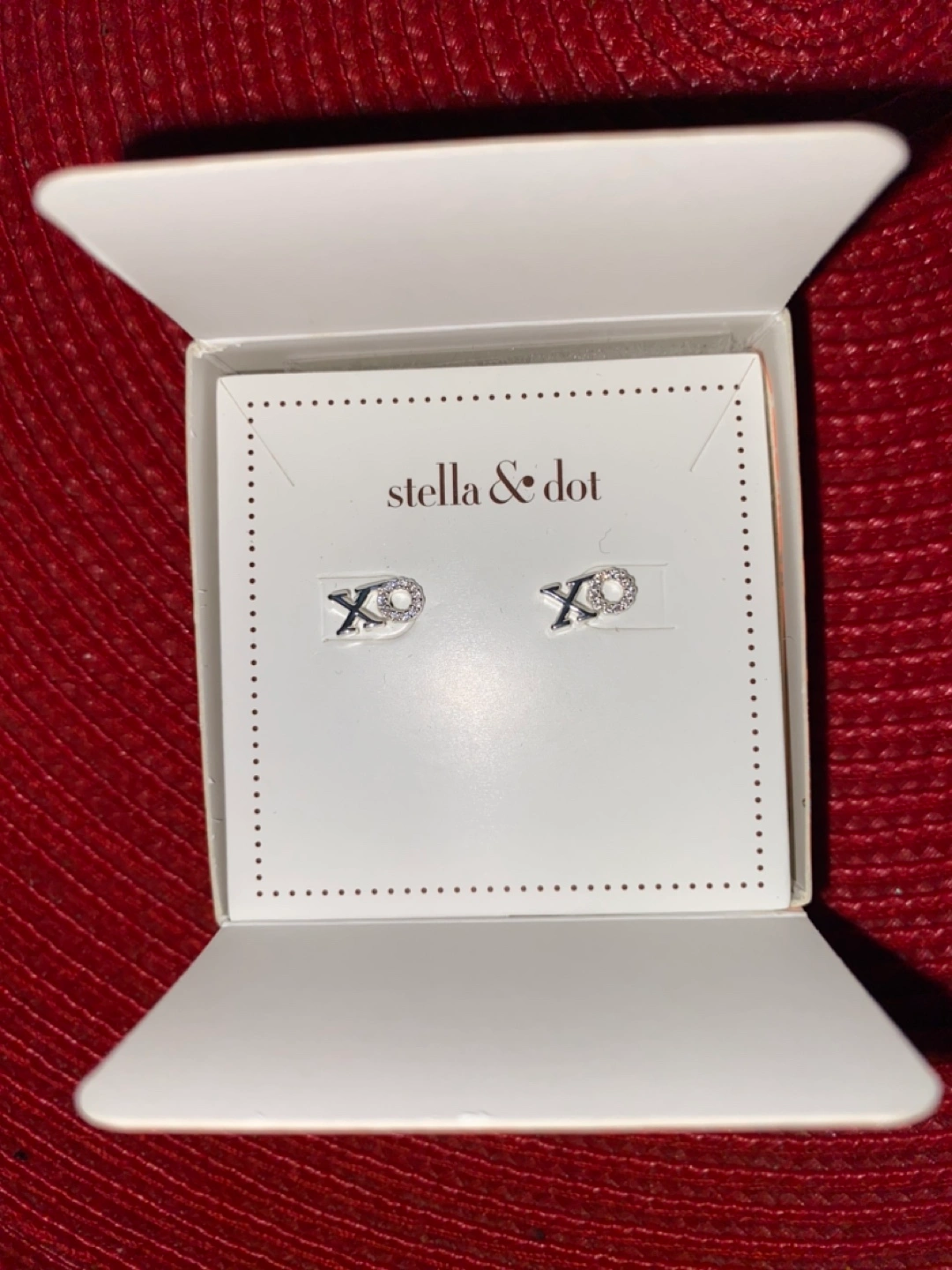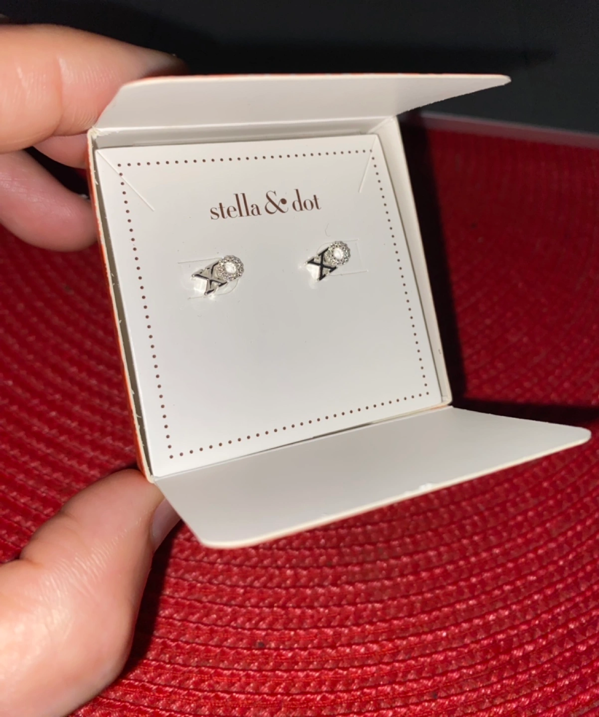 Super cute XOXO Stella & Dot Stud Earrings - E510S Handset pave, Silver plated with a shiny finish, 1/2", Featherweight, Titanium posts, brand new in gift box.
