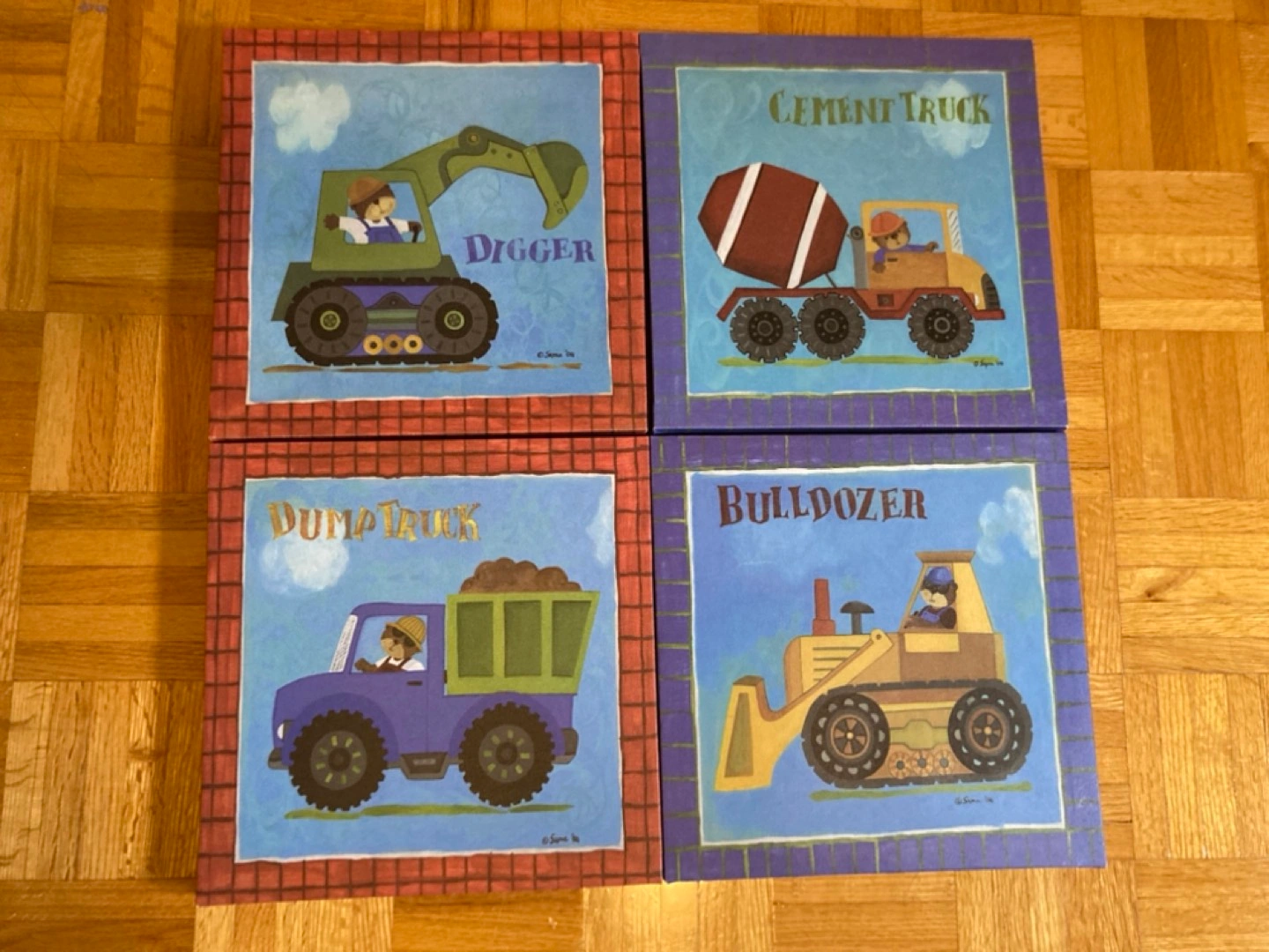 Construction themed canvas art. Four different frames that can be rearranged. Perfect for bedroom decor.