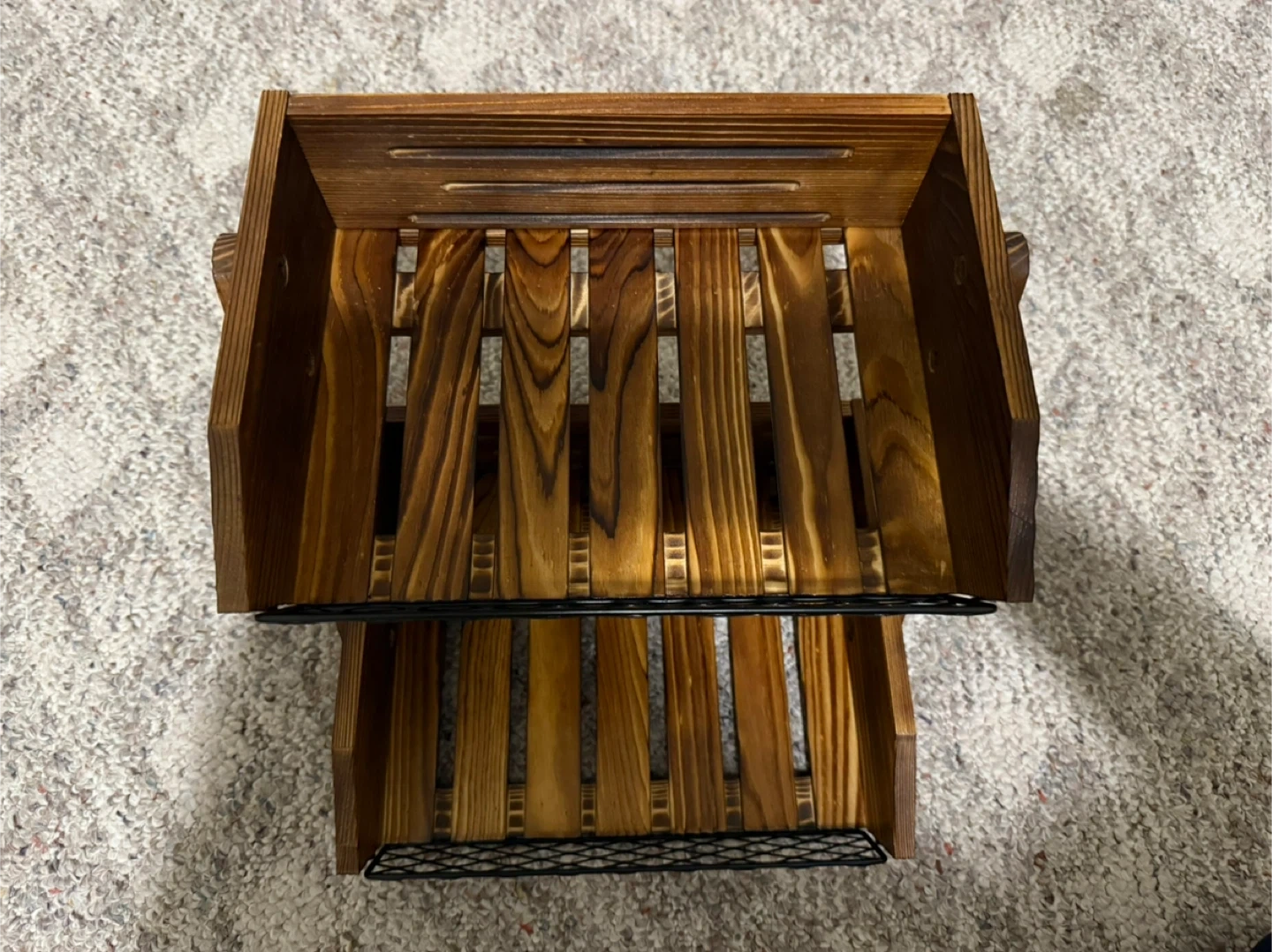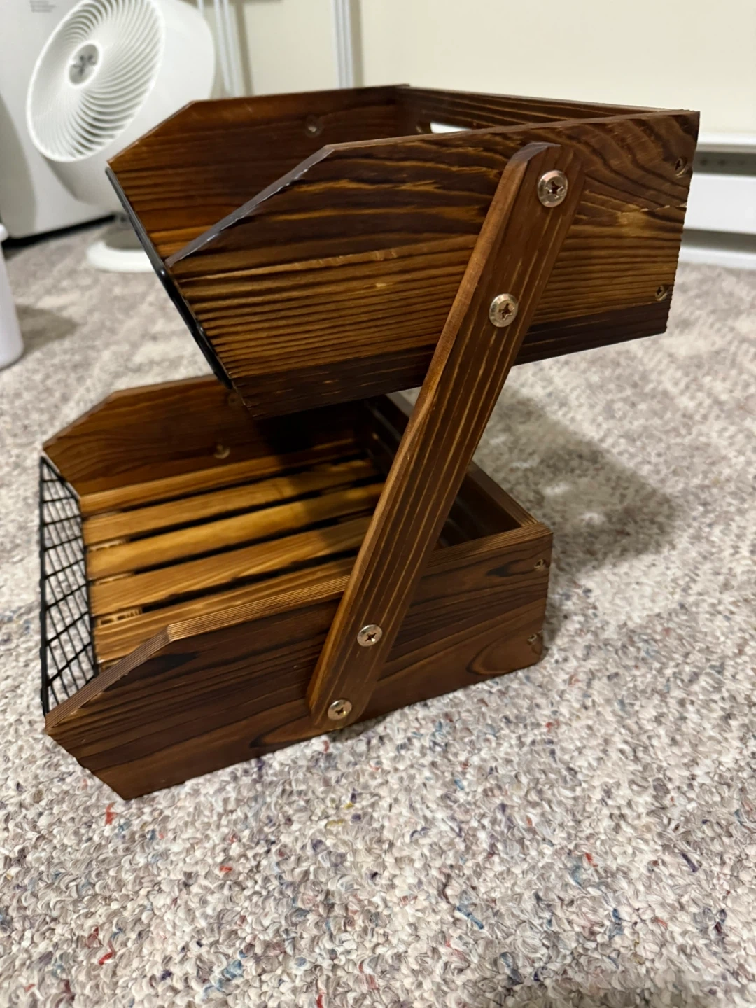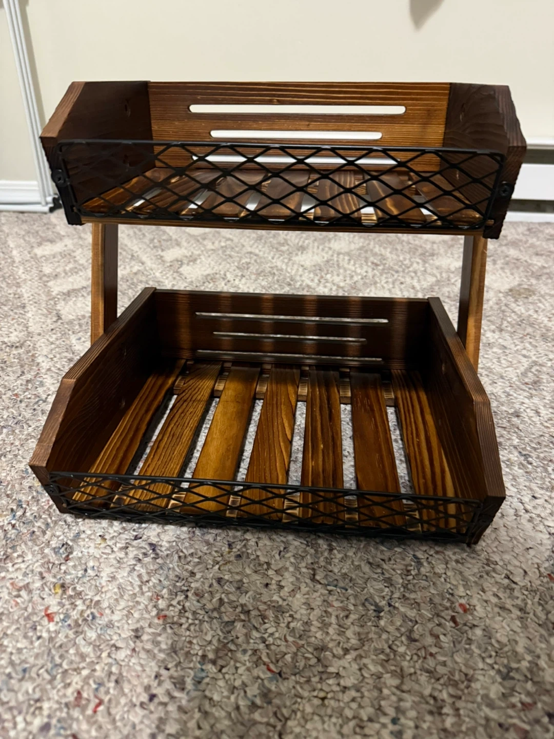 This two-tier basket stand is perfect for organizing fruits or vegetables in your kitchen. It's made of wood with black wire mesh accents. Great for countertop storage!