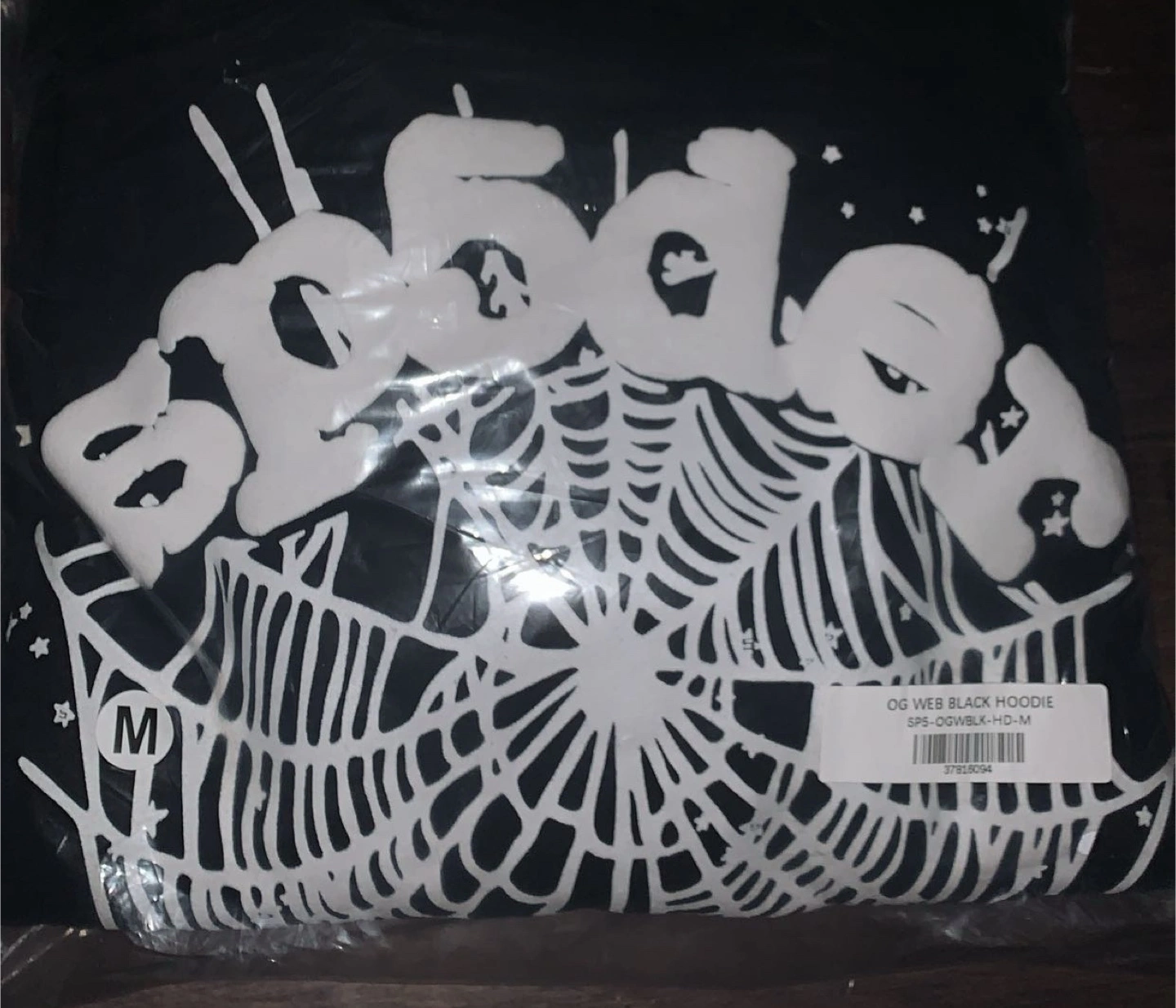 This is an OG Spider black hoodie. It's size medium and features a web design. This hoodie is made of cotton.