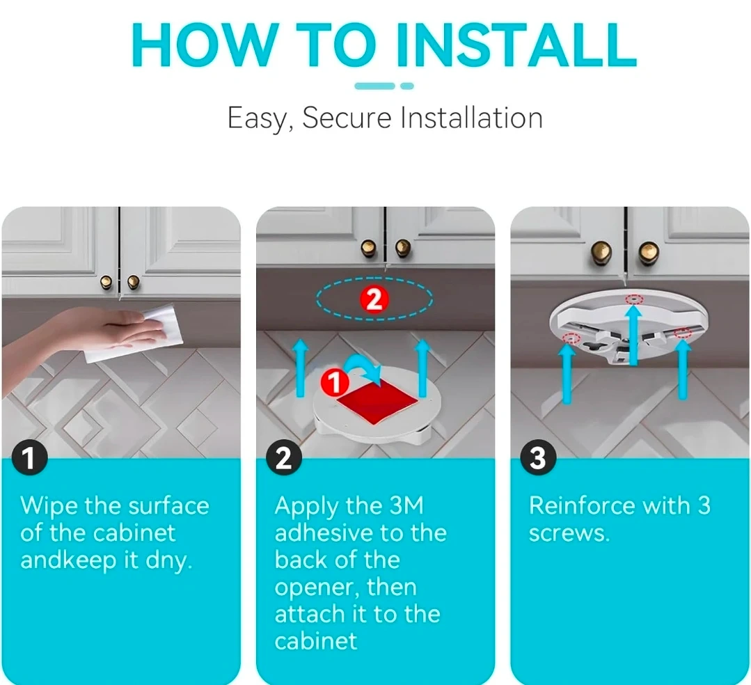 This multifunctional bottle opener easily opens jars and bottles, suitable for lids between 3-11cm in diameter. It features an under-cabinet design for convenient storage and use. Installation is simple with the included adhesive and screws.