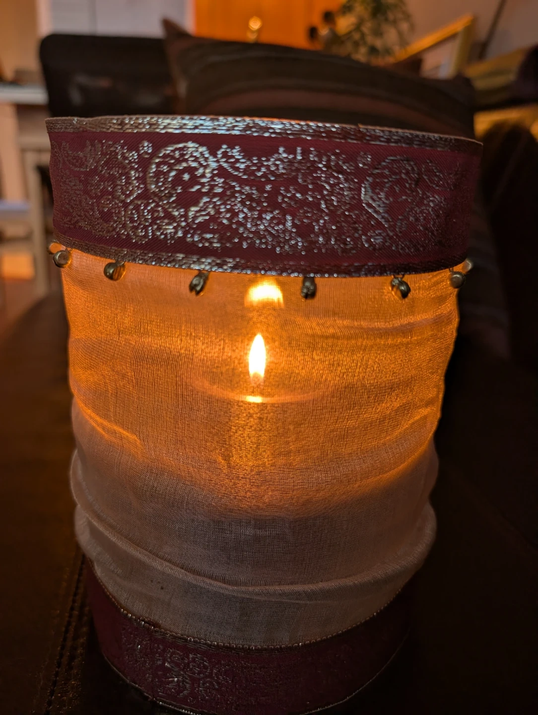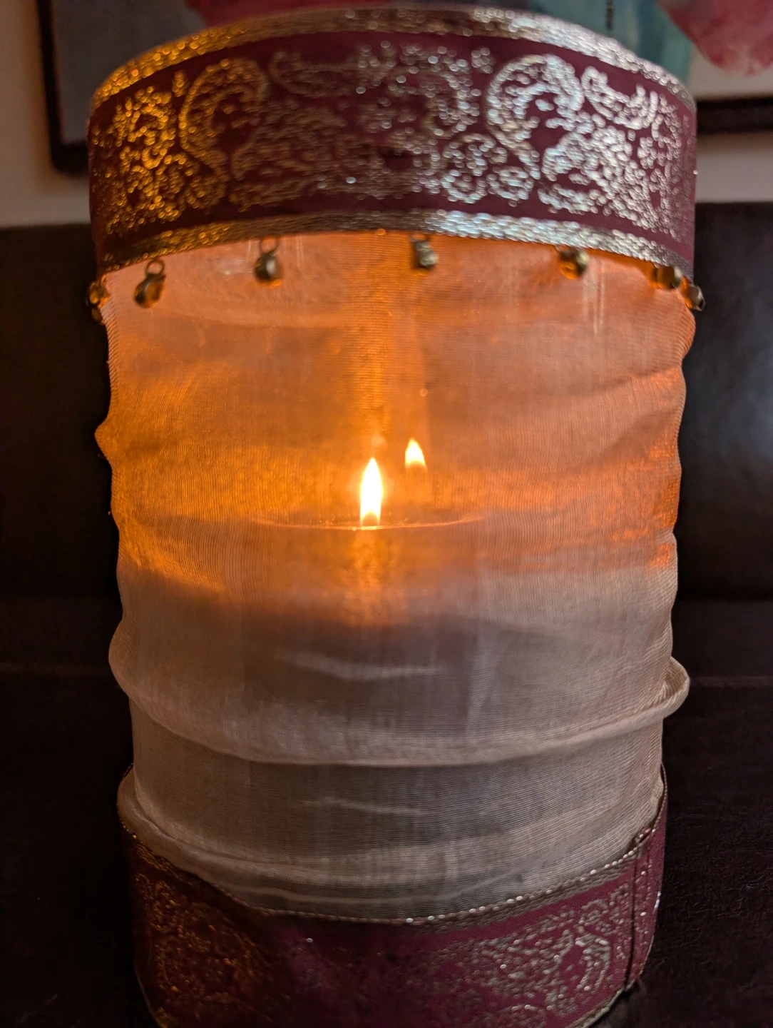 Pretty decorative lantern with a lit candle inside. It features ornate burgundy and gold trim at the top and bottom, with sheer fabric wrapped around the body. Tiny bells hang from the upper trim for a lovely touch. Adds a warm ambiance to any room!