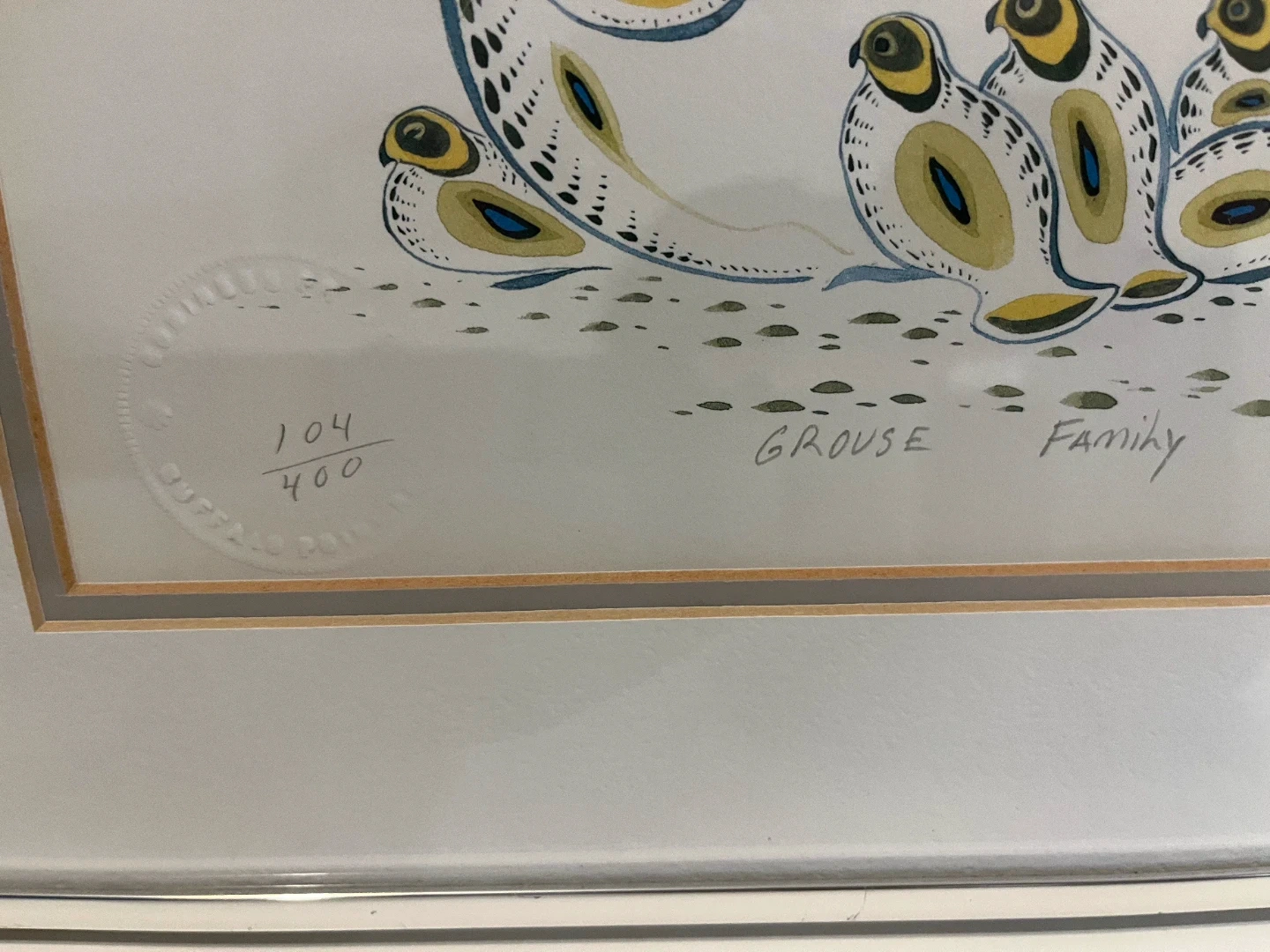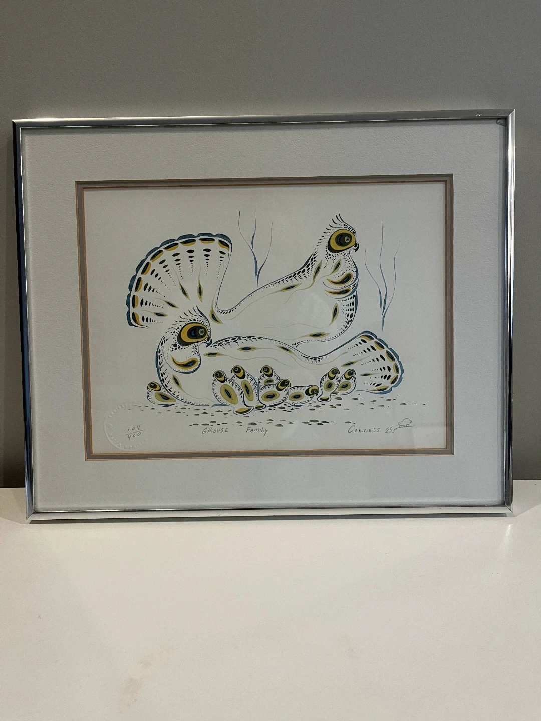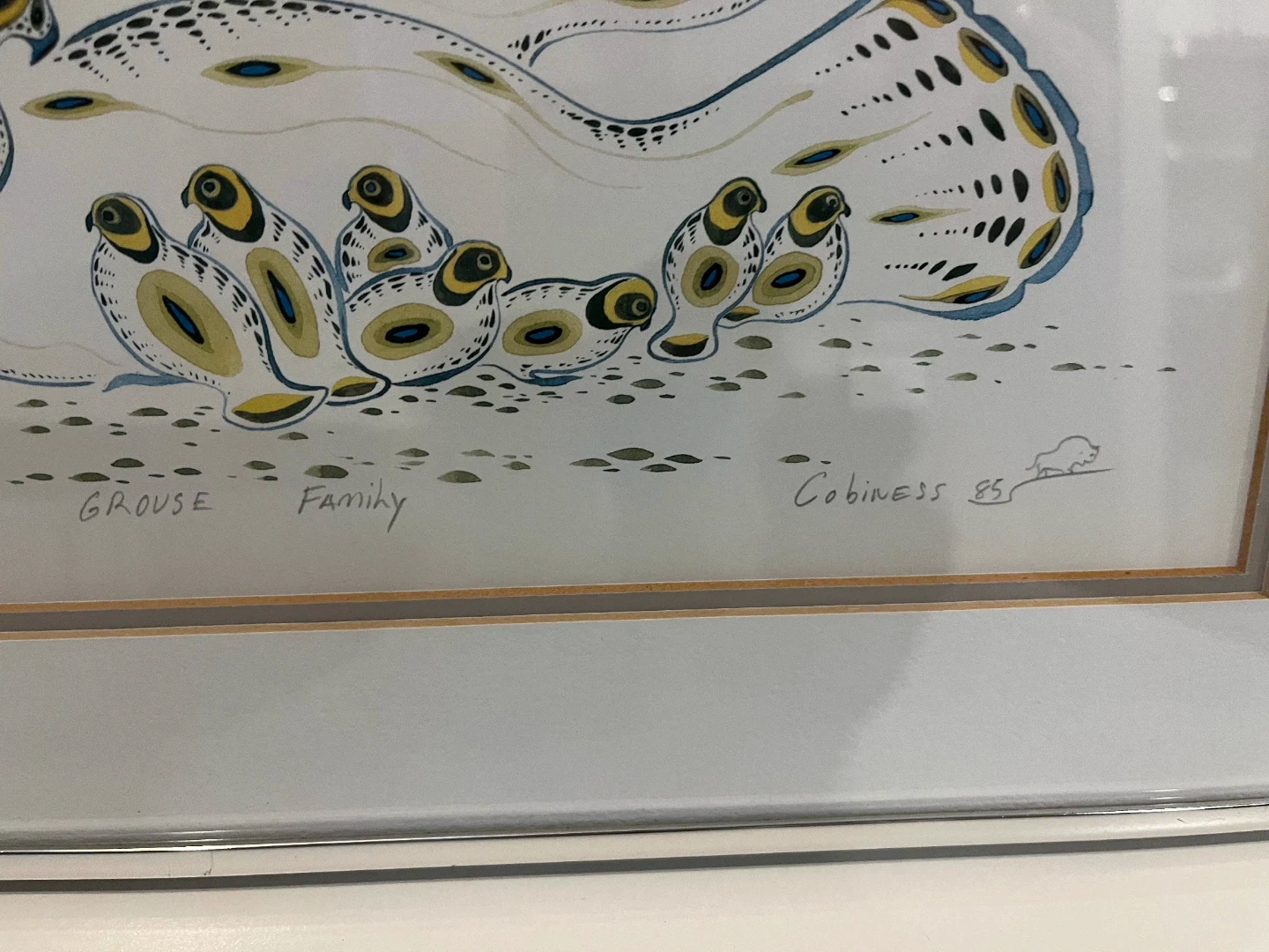 Framed art print titled "Grouse Family" by famed native artist Cobiness, dated '85. Edition 104 of 400. This artwork depicts a family of grouse with a distinctive art style. Perfect for art collectors and bird enthusiasts!