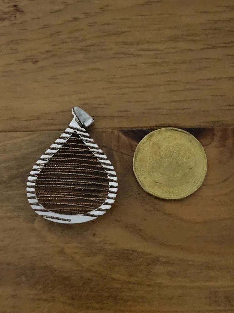 134Selling a teardrop-shaped pendant marked '925 ITALY AGI'. It is made of sterling silver with a woven design inside the teardrop shape. It's in good condition and ready for a new home