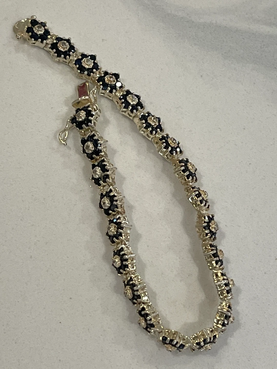 Selling a lovely silver-tone bracelet! Try diamonds and blue sapphires ! It features a delicate floral design . It's in New condition and would be a beautiful addition to any jewelry collection