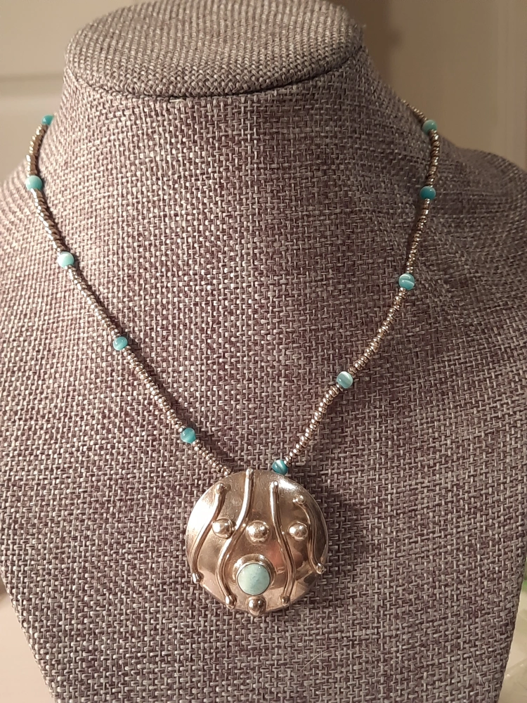 Selling a unique 925silver pendant necklace!with blue stone larimar ,and 925 chain as well The pendant has a round shape with an interesting design and a turquoise-coloured stone in the centre. The necklace features silver-coloured beads with occasional turquoise beads that match the pendant's stone. The pendant measures approximately 3 inches in diameter.
