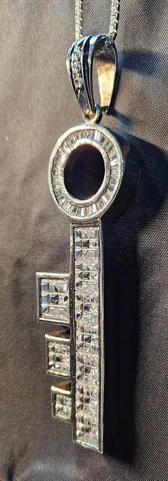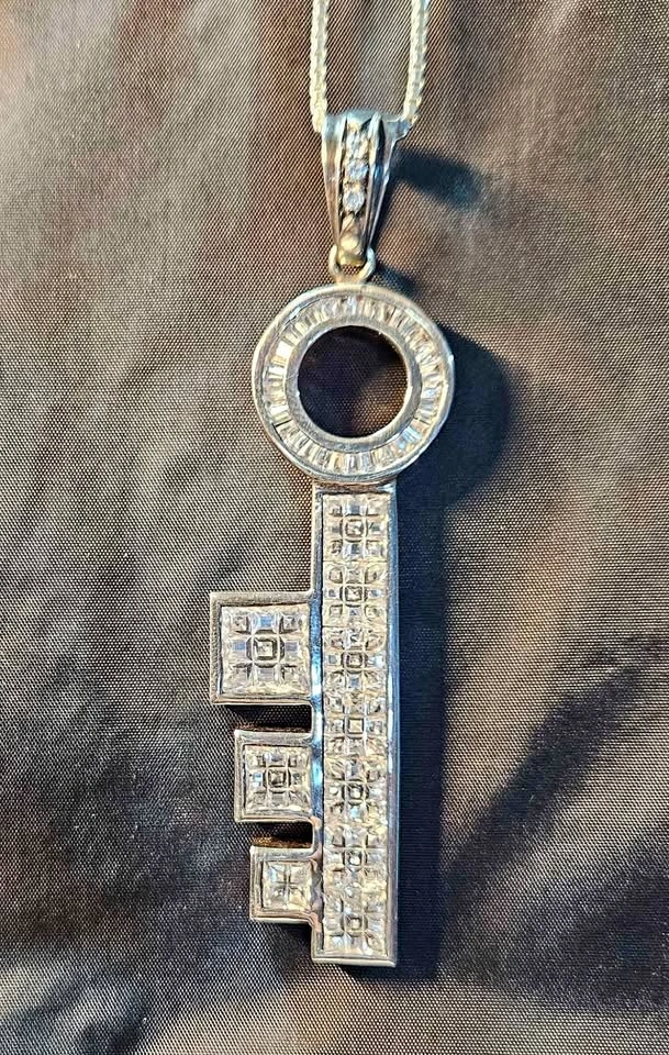 925 sterling Length of key is 3.5" with the loop it measures 4". Weight is 47.5 g *chain not included, chain is 925 - 29" long, 12.2 g = $60