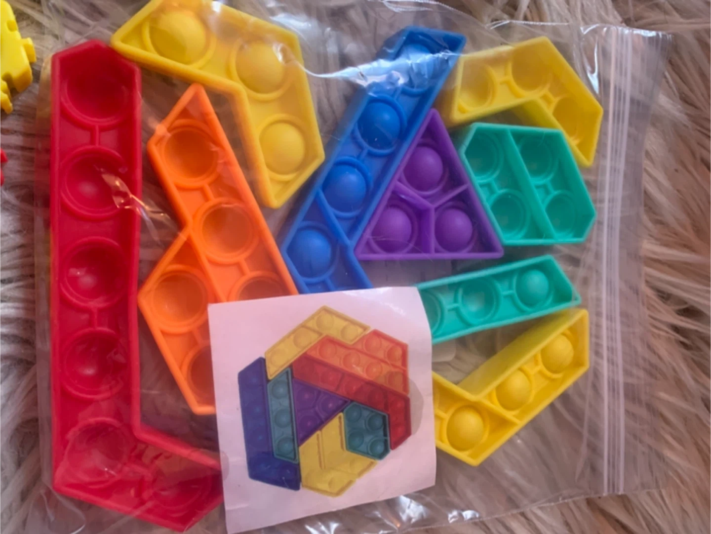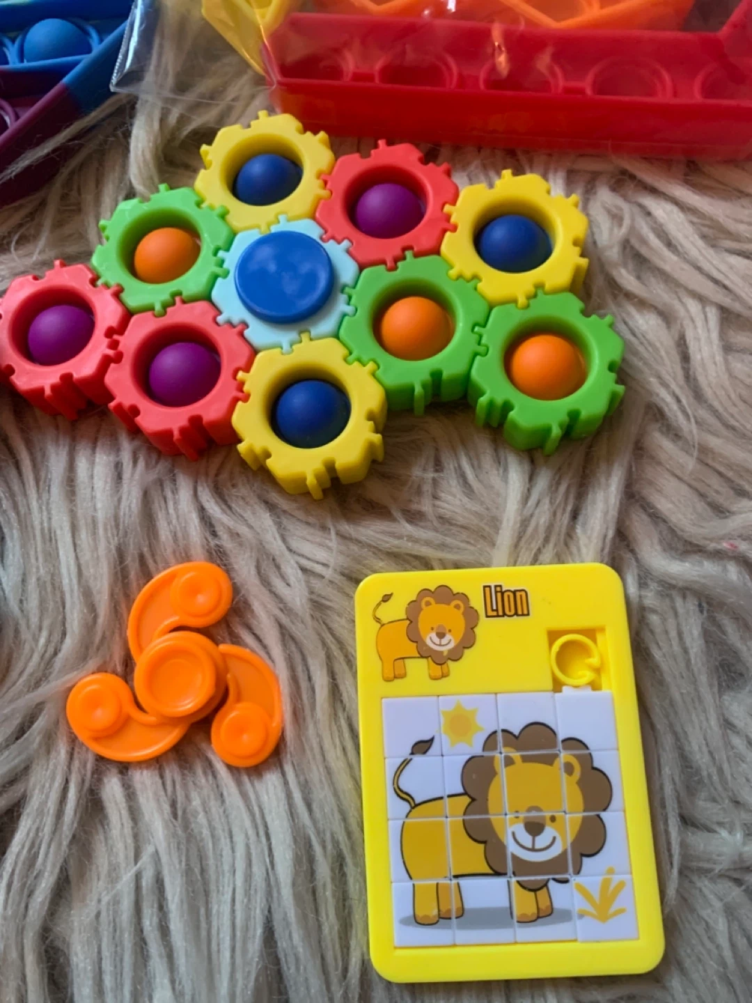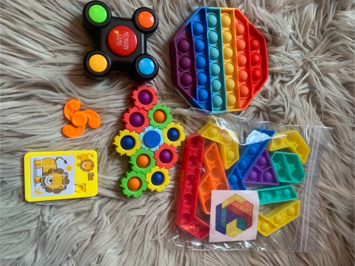 This bundle includes a fun memory game, a rainbow octagonal pop-it, a gear-shaped fidget toy, a lion slider puzzle, and a bag of various pop-it shapes. Great for keeping hands busy and minds engaged!