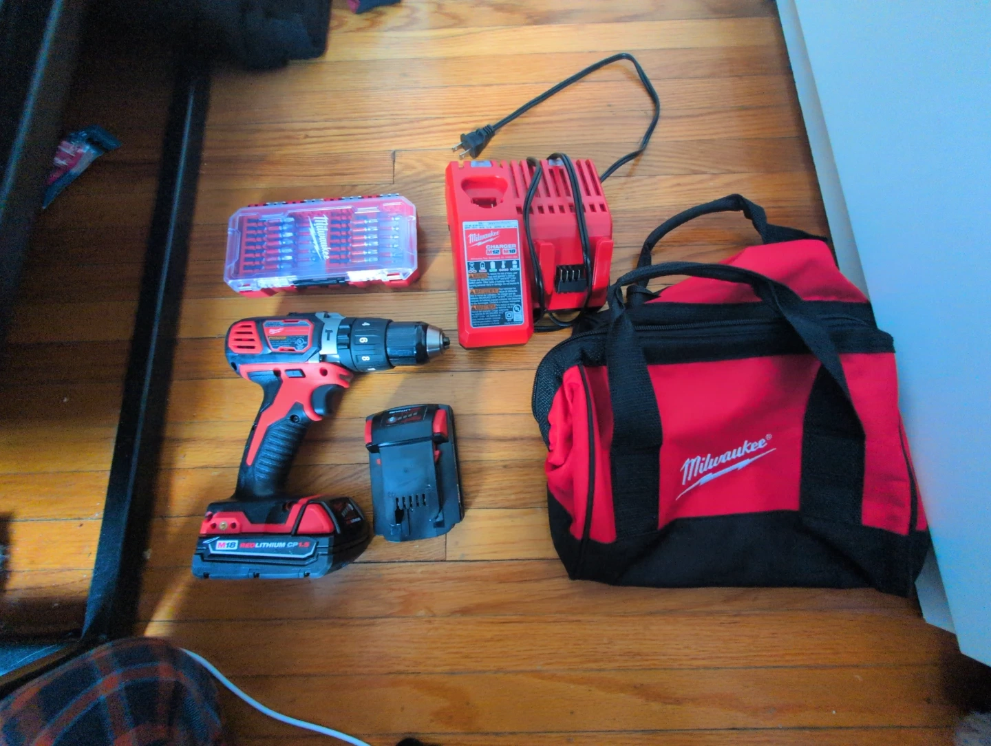 This is a Milwaukee M18 cordless drill kit. It comes with a drill, M18 Lithium CP 1.5 battery, charger, and a carrying bag. A set of drill bits is also included.