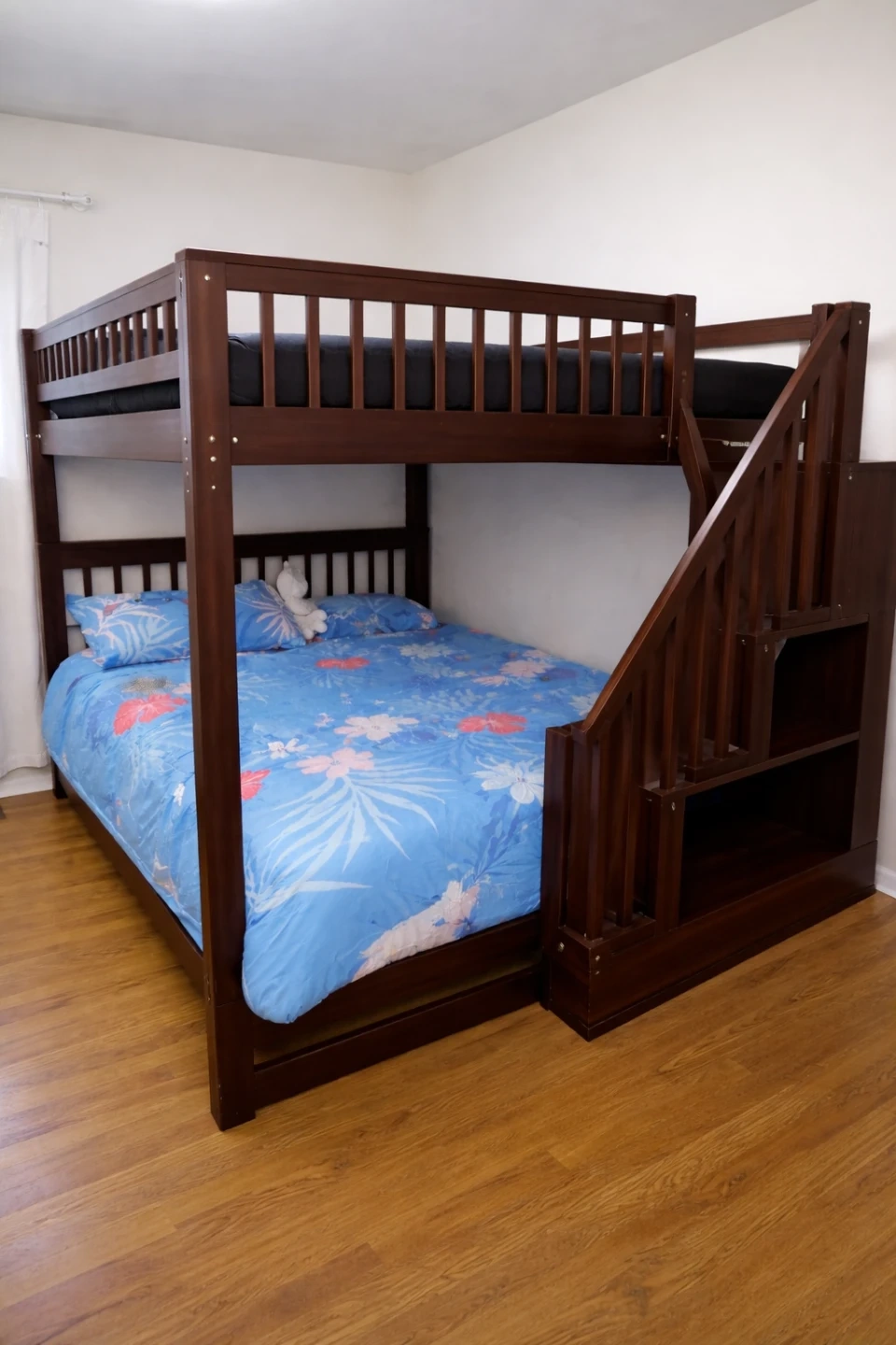Recently purchased this dark wood bunk bed features a full-sized lower bunk and a full-sized upper bunk. It includes a staircase with built-in storage shelves for easy access, twin trundle underneath and organization. Comes with 1 year warranty. Mattresses are not included.