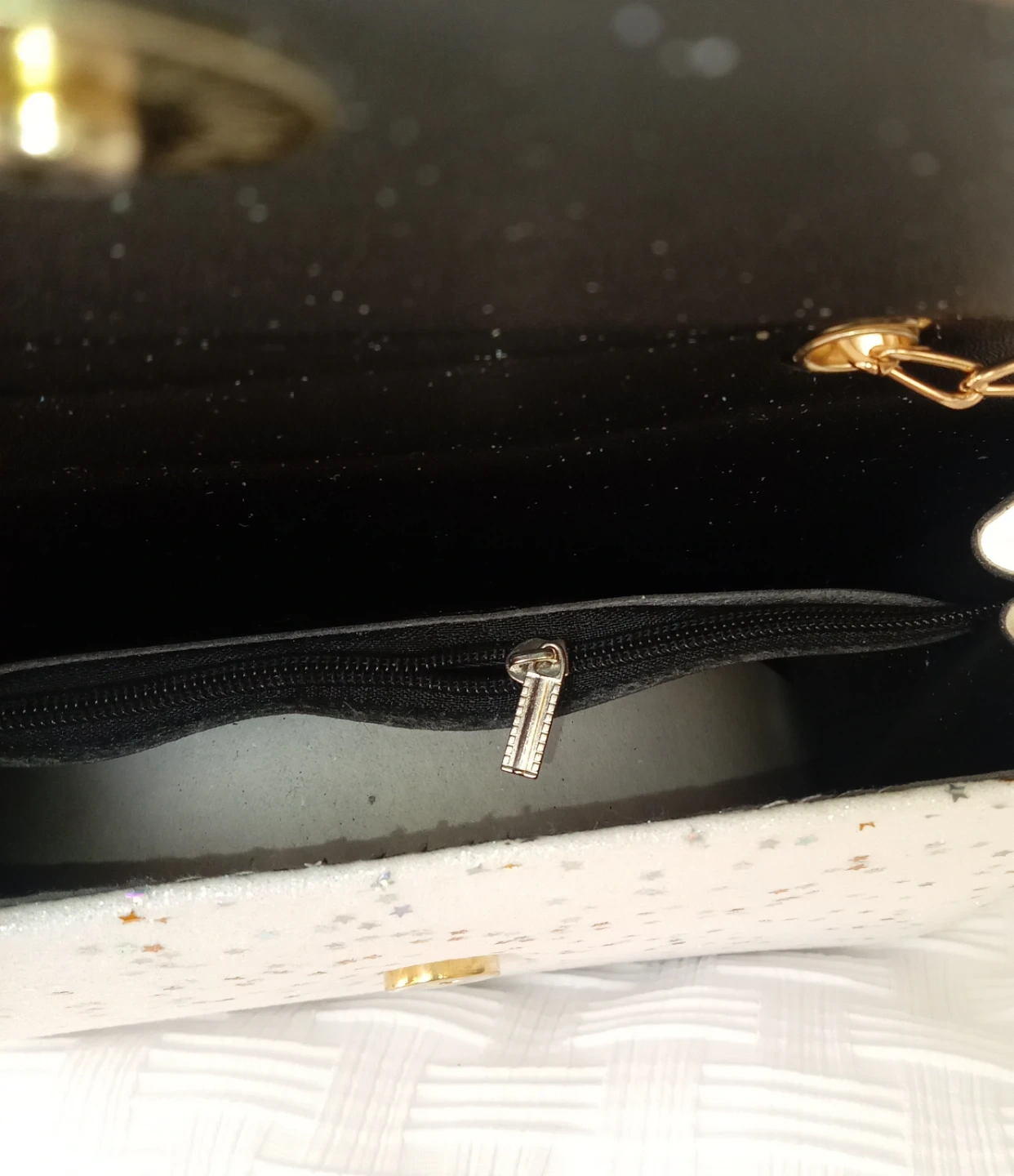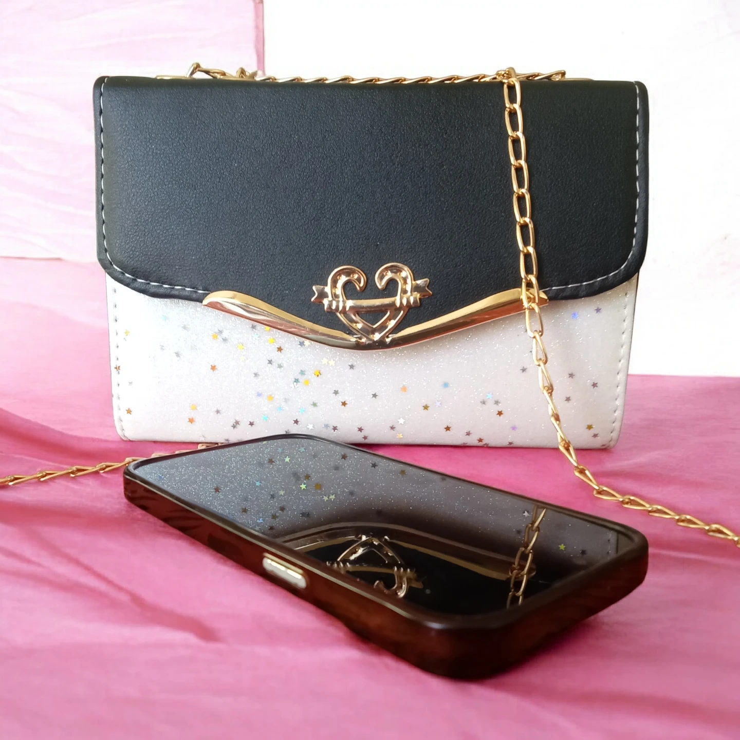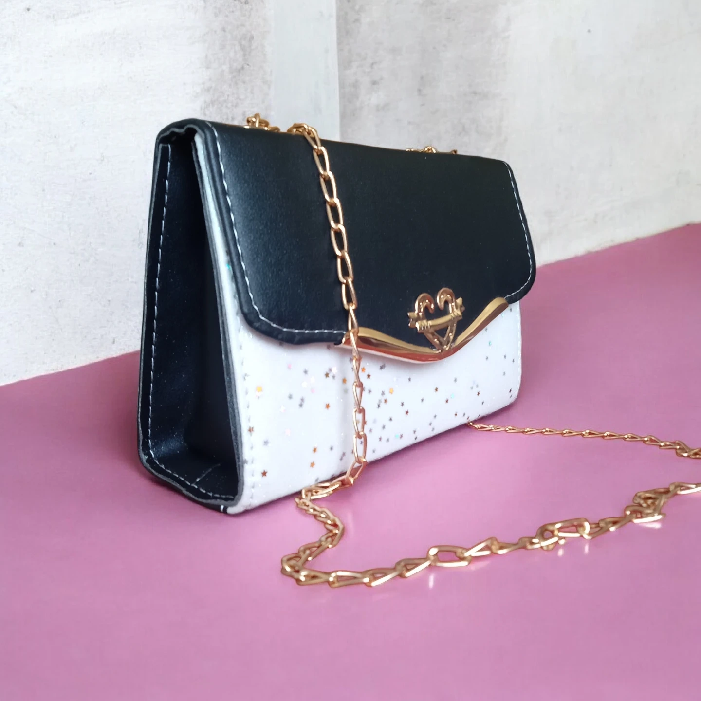 This stylish clutch features a black and white exterior with a glitter star pattern. It includes a detachable gold chain strap for versatile wear. The interior has a zippered pocket for secure storage.
