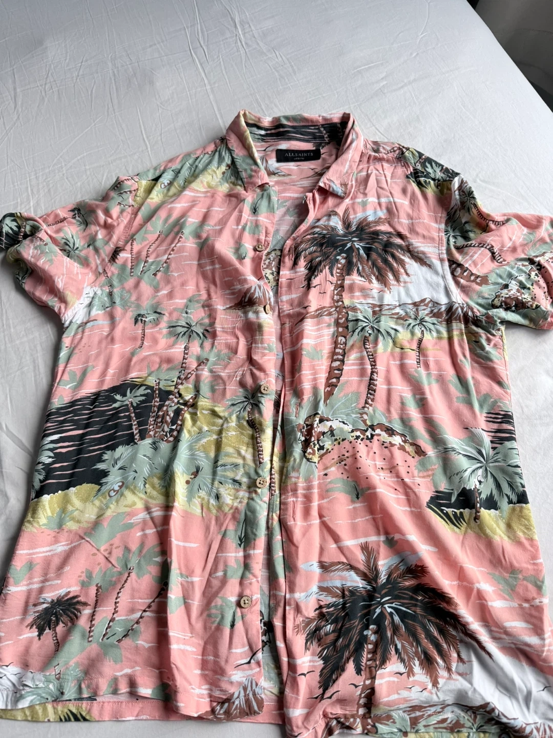 This is an AllSaints short-sleeved Hawaiian shirt. It's made with a colourful tropical print. Short sleeves are great for warm weather!