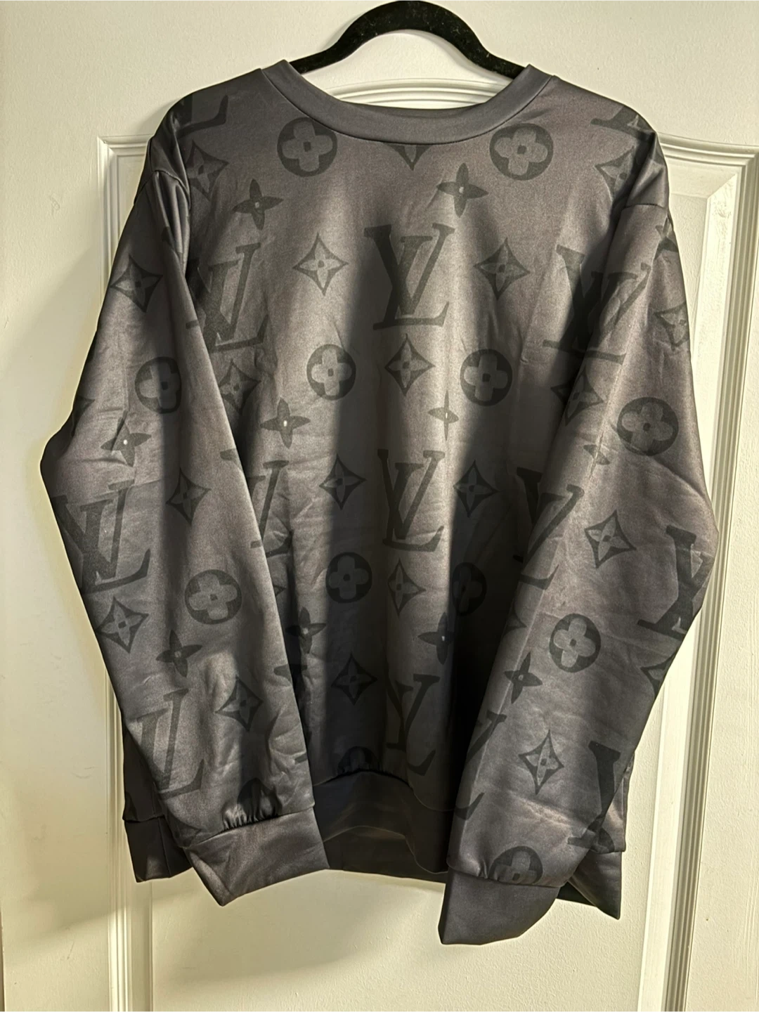 This dark grey sweatshirt features a repeating Louis Vuitton-inspired monogram print all over. It's a crewneck style with long sleeves. The material appears to be a smooth, possibly polyester blend.