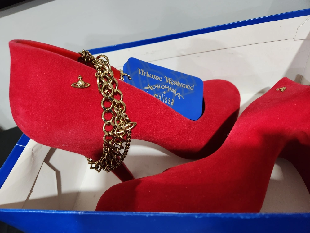Gorgeous hot red stylish pumps . Heel height 10 cm. They come with a very chic ankle chain. Durable, flexible, and comfortable shoes. Eco-friendly material. See all pics. Available for pickup near Martin Grove and Westway . Welcome to see my other listings. Smoke and pet -free home .