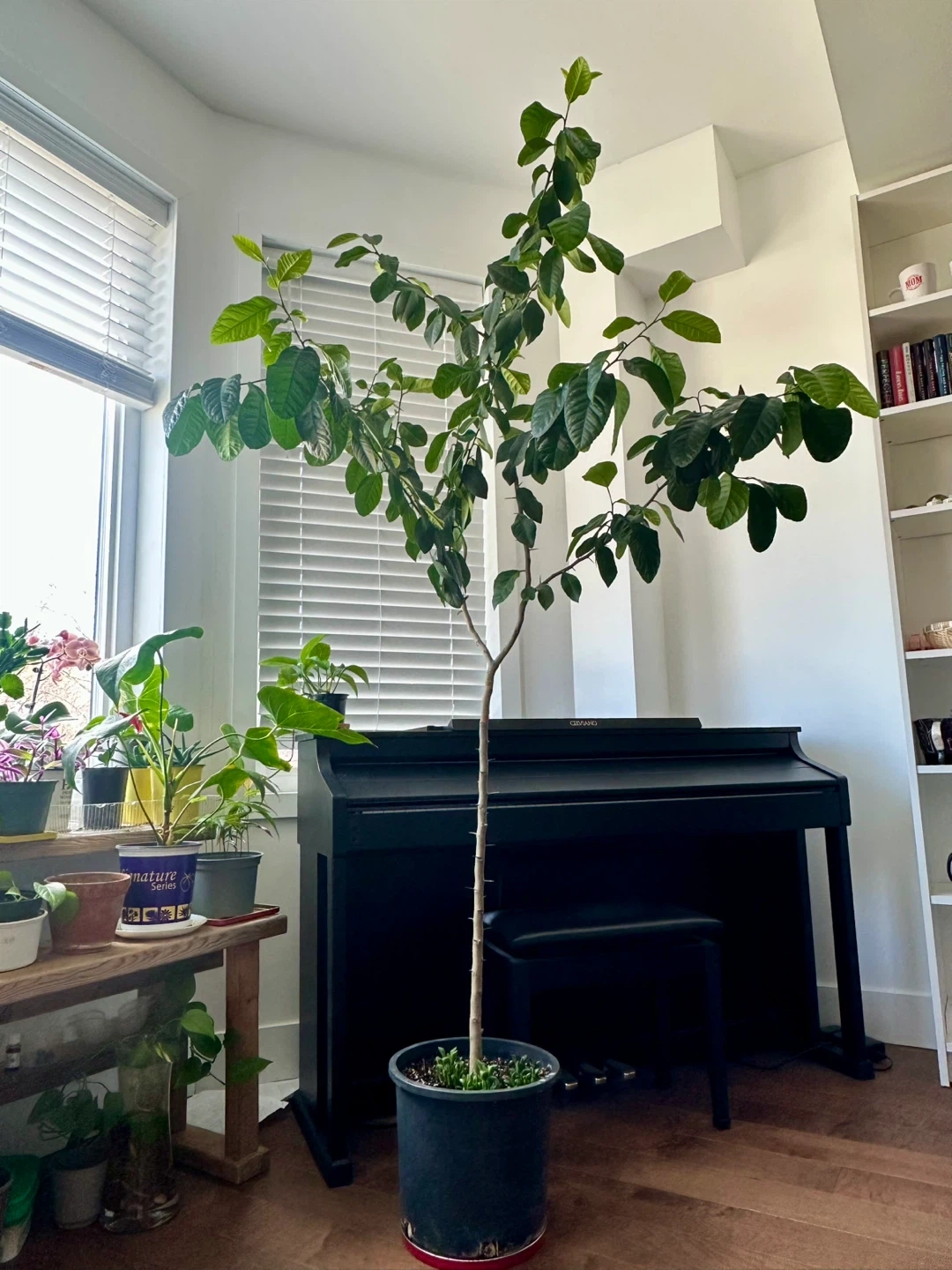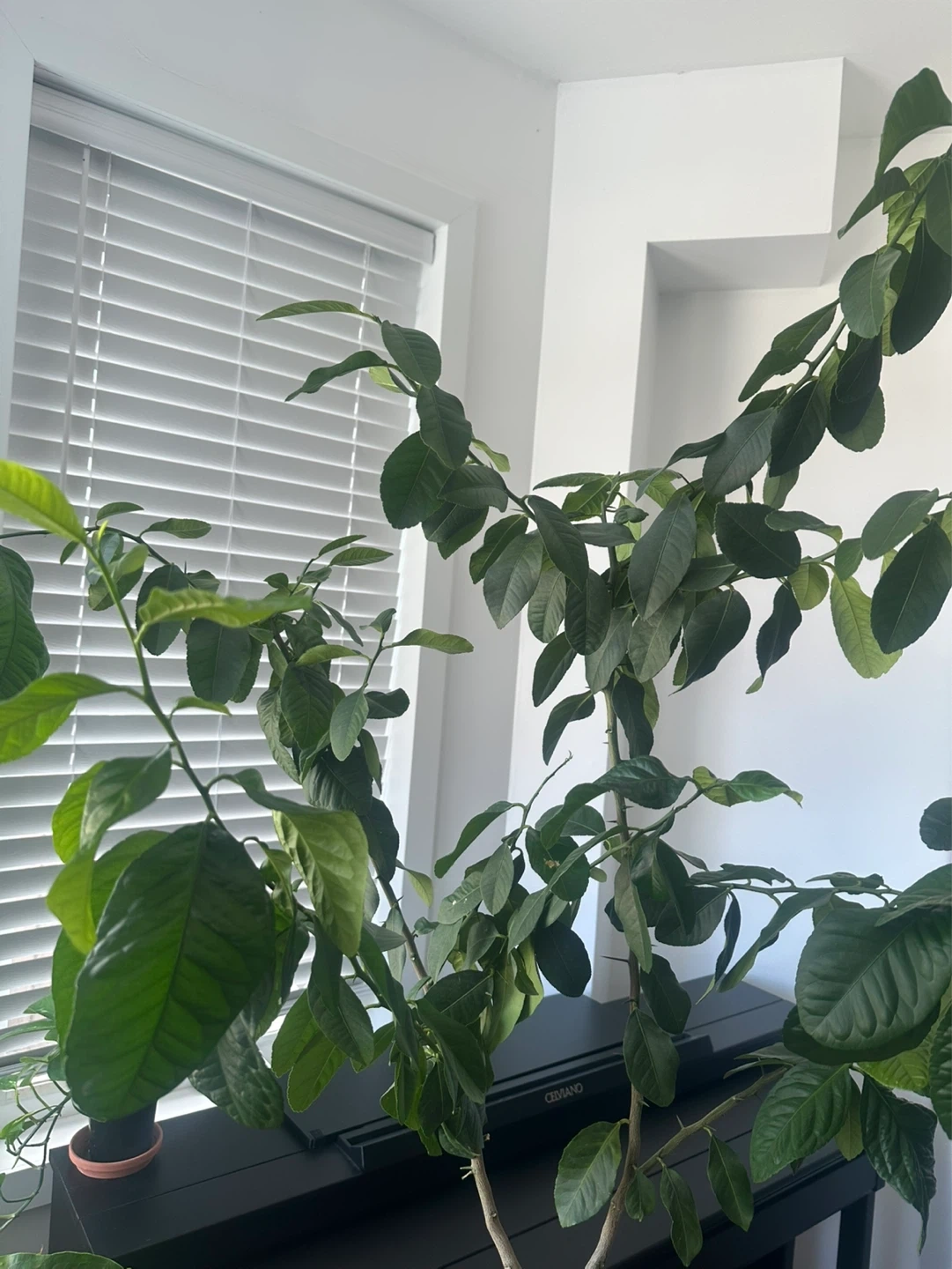 A healthy, leafy potted lemon tree plant in a 12 inch black planter. I have planted this tree from seeds for more than three years. It stands about 210 cm tall and has a sturdy trunk. This plant would add a nice touch of green to any indoor space!