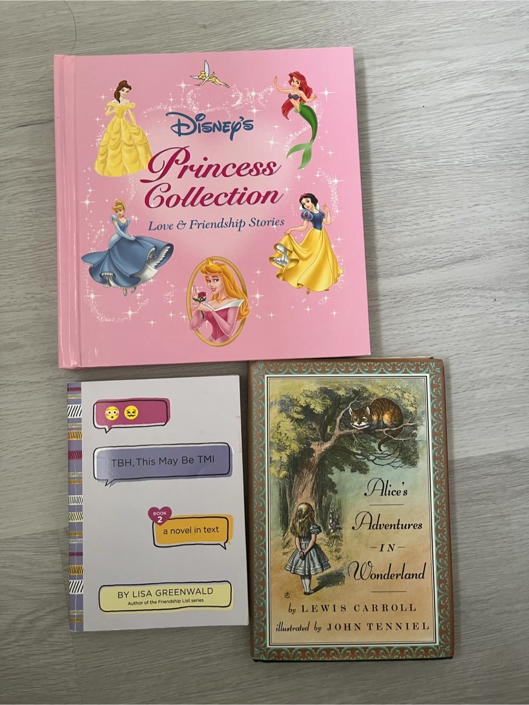 This lot includes Disney's Princess Collection: Love & Friendship Stories and Alice's Adventures in Wonderland by Lewis Carroll. Both are children's books. Perfect for young readers who love classic tales and princesses.