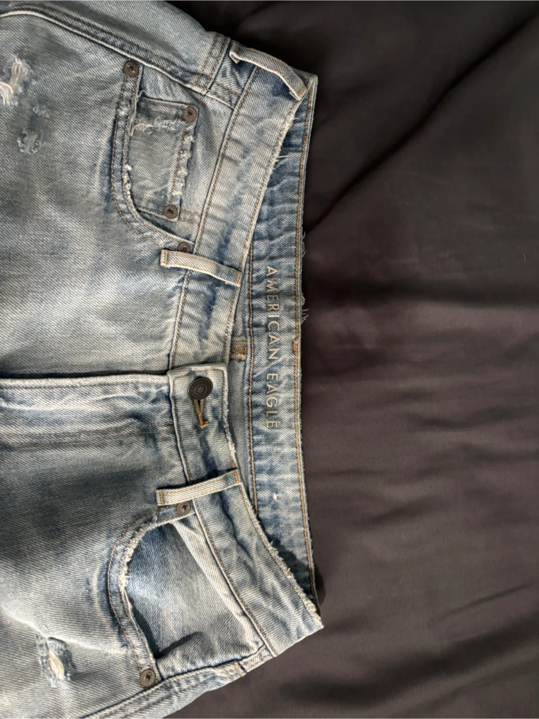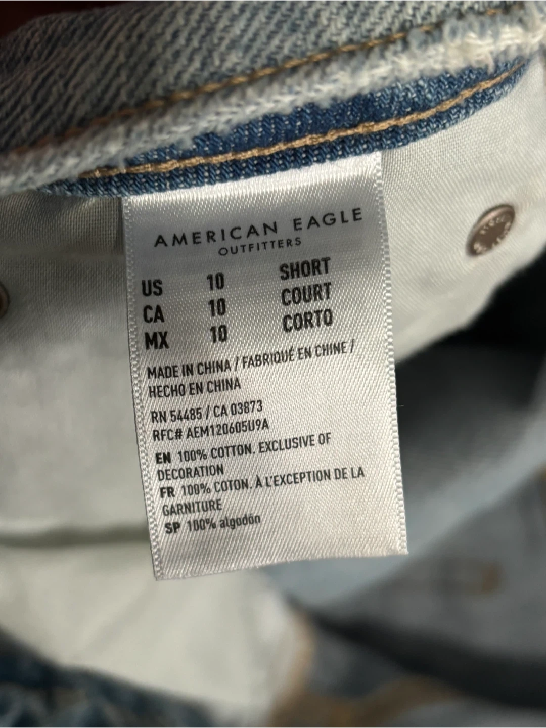These are light wash denim jeans from American Eagle Outfitters. They're 100% cotton. The size is 10 Short. Bought over a year or 2 ago but never worn.