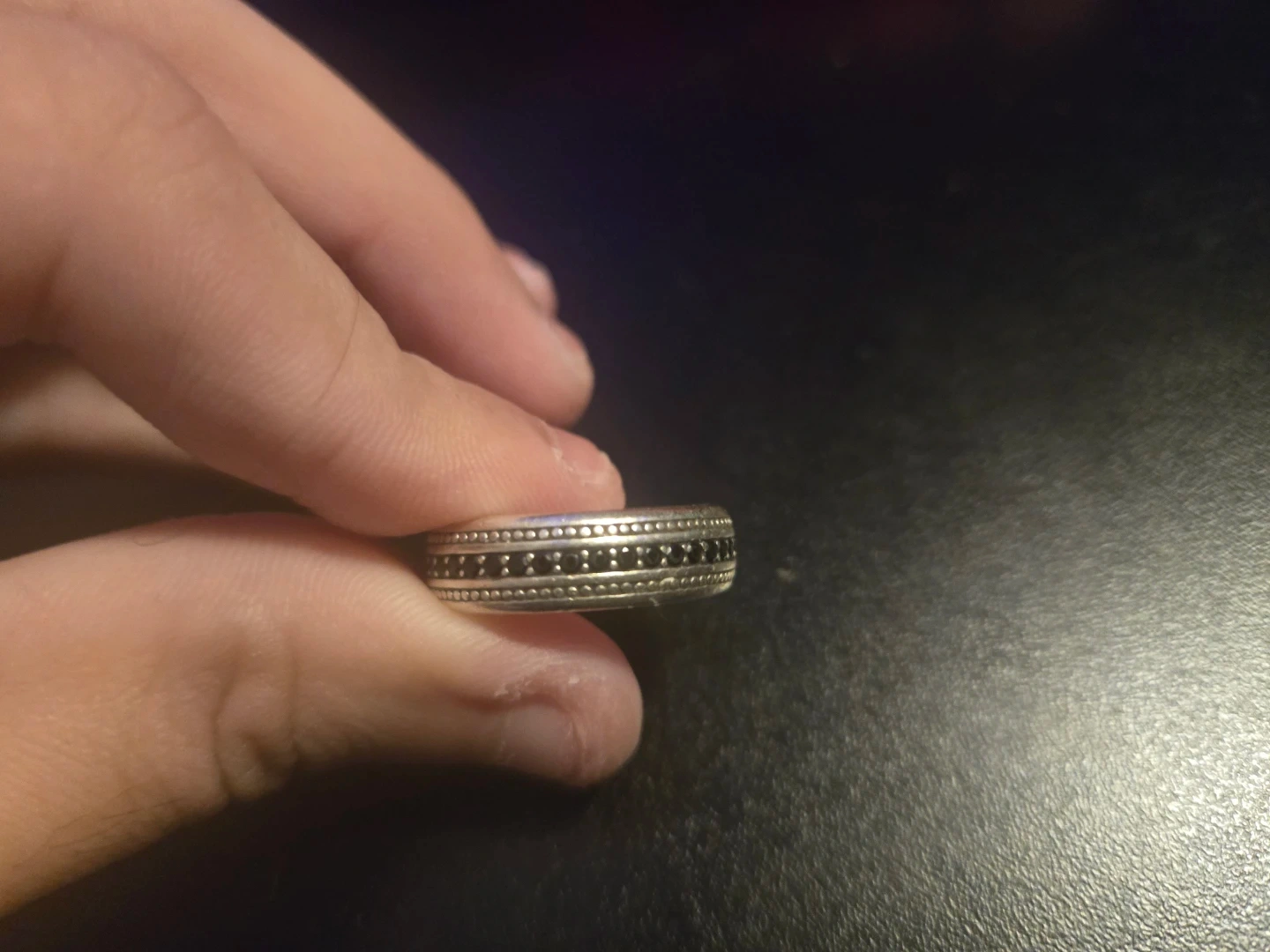 A silver-toned ring featuring rows of small black stones. It has a beaded edge detail. This ring would make a nice addition to an accessory collection.