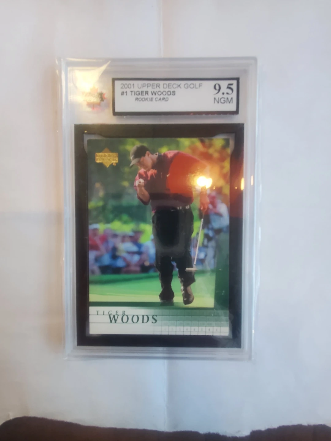 This is a 2001 Upper Deck Golf card featuring Tiger Woods. It's his rookie card, graded at 9.5 NGM. The card showcases Tiger Woods in action on the golf course.