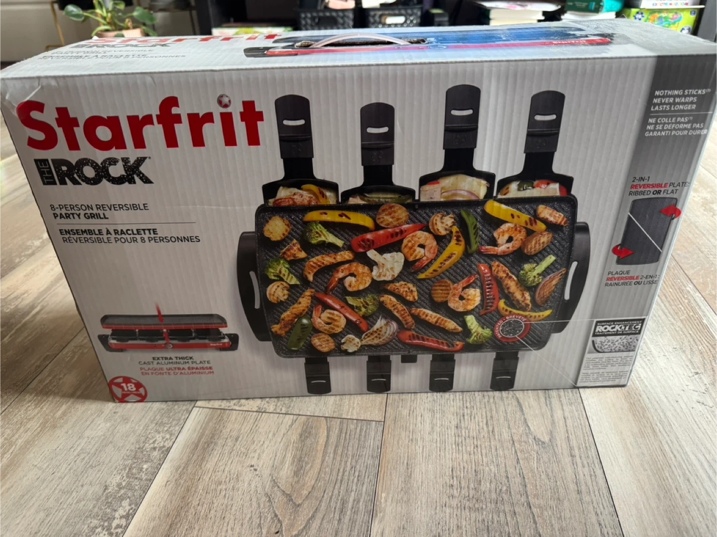 This Starfrit The Rock 8-person party grill features a reversible plate that's ribbed or flat. It has an extra thick cast aluminum plate for durability. This grill is great for hosting gatherings!