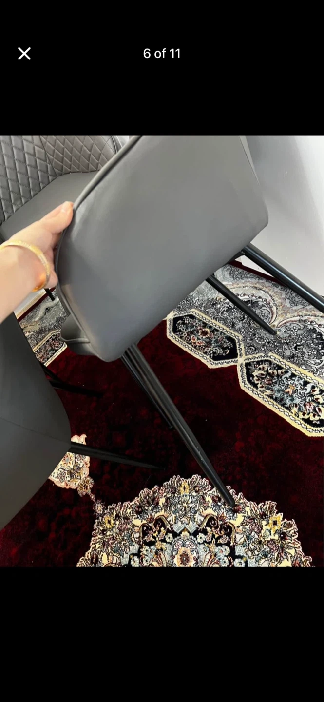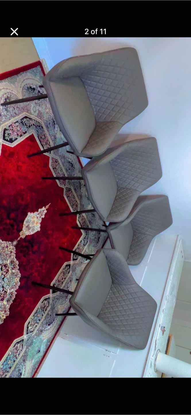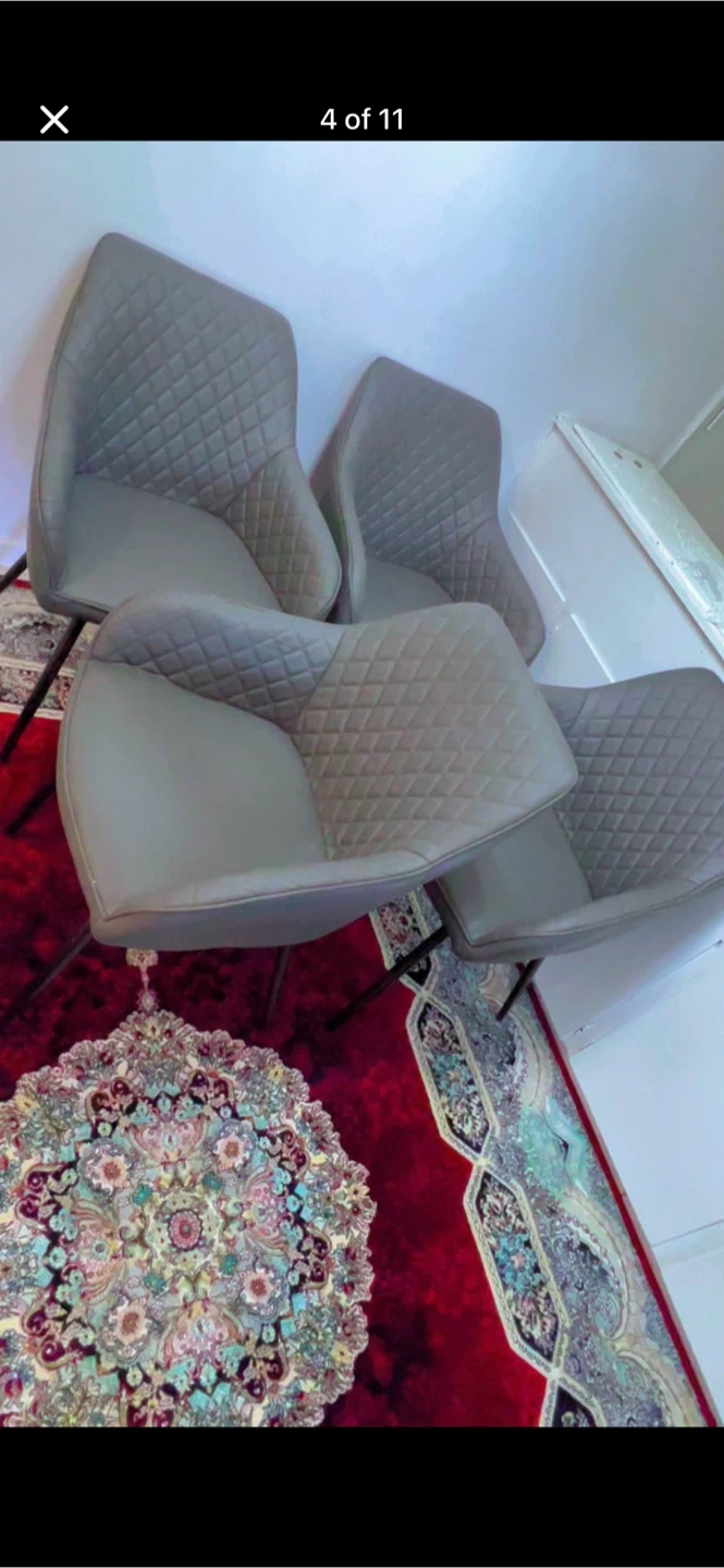 Four modern dining chairs upholstered in grey faux leather. They feature a diamond-stitched backrest and a sleek, minimalist design with black metal legs. These chairs offer comfortable seating and a stylish addition to any dining area. Perfect for everyday meals or entertaining guests!