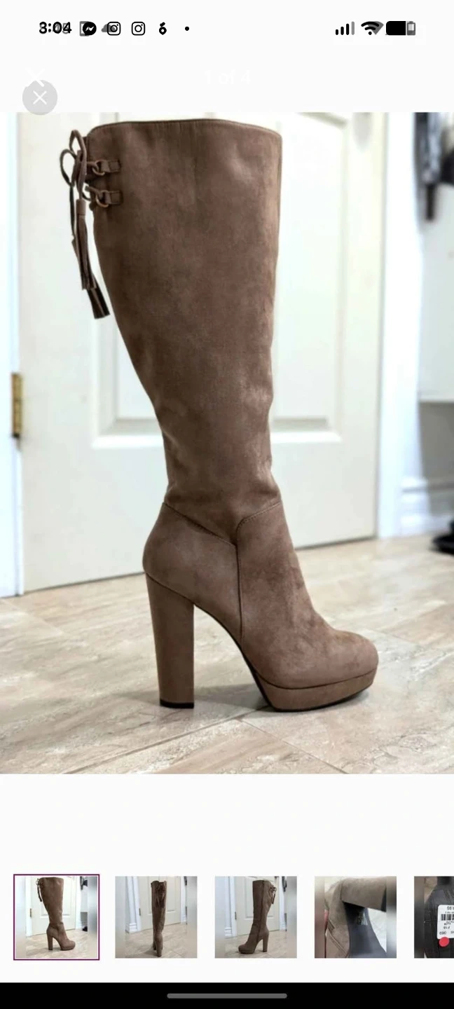 These taupe knee-high boots are crafted from faux suede material. They feature a side zipper and decorative lace-up detail with tassels at the back. The boots have a platform front and a block heel.