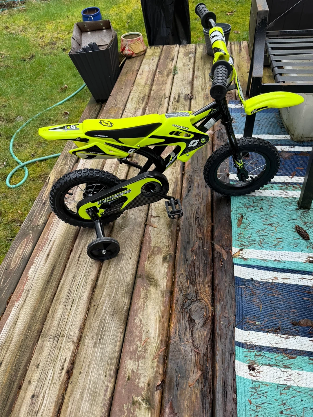 Kids bicycle suitable for begginers with a dirt bike feel. This kids' bicycle is designed to look like a cool "motobike" and comes in a bright, eye-catching yellow colour. It includes training wheels for beginners, making it super easy to learn to ride. Pedal bike with knobby tires for good grip. Great for young riders just starting out!