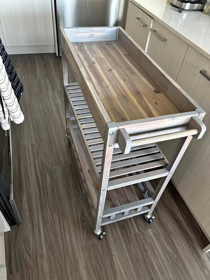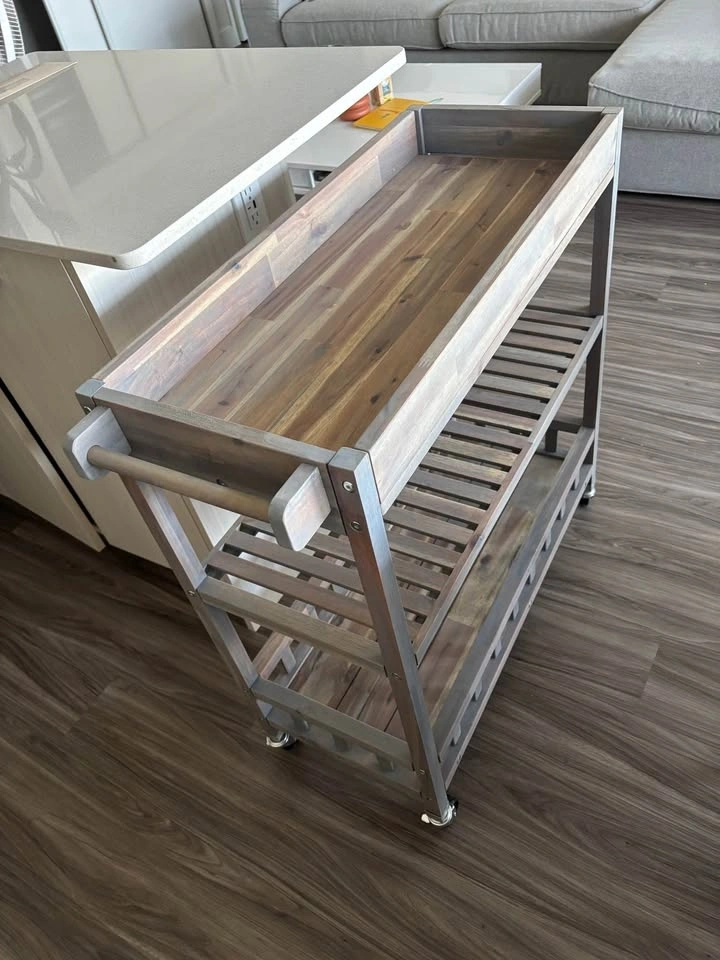 Brand new in box, 3 Tier Acacia Hardwood Kitchen Cart, Portable Rolling Trolley Cart Kitchen Storage Utility Cart with Towel Rack. Color: Dusk Grey. Dimensions: 31.4"x13.7"x33.4", with Tray. Feel free to message if you have any questions!