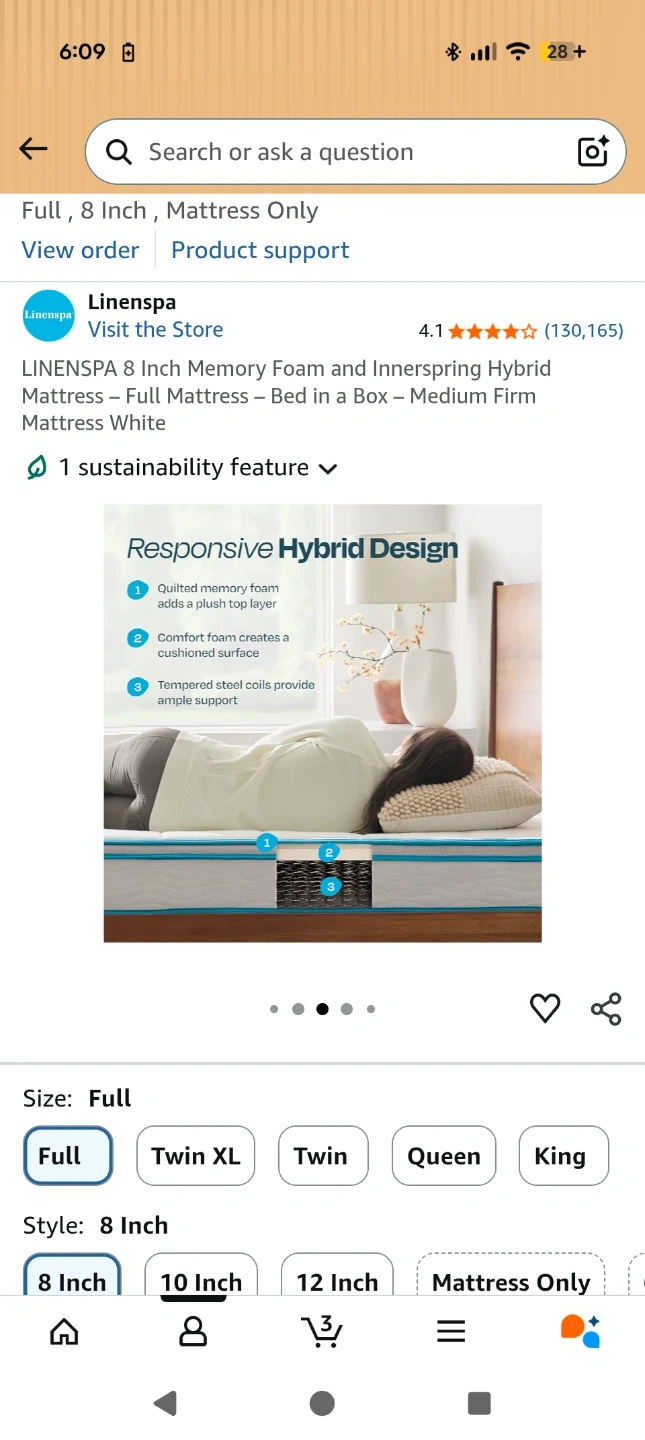This is a LINENspA 8-inch hybrid mattress. It's a full-size mattress with memory foam and innerspring. It offers a medium-firm feel.