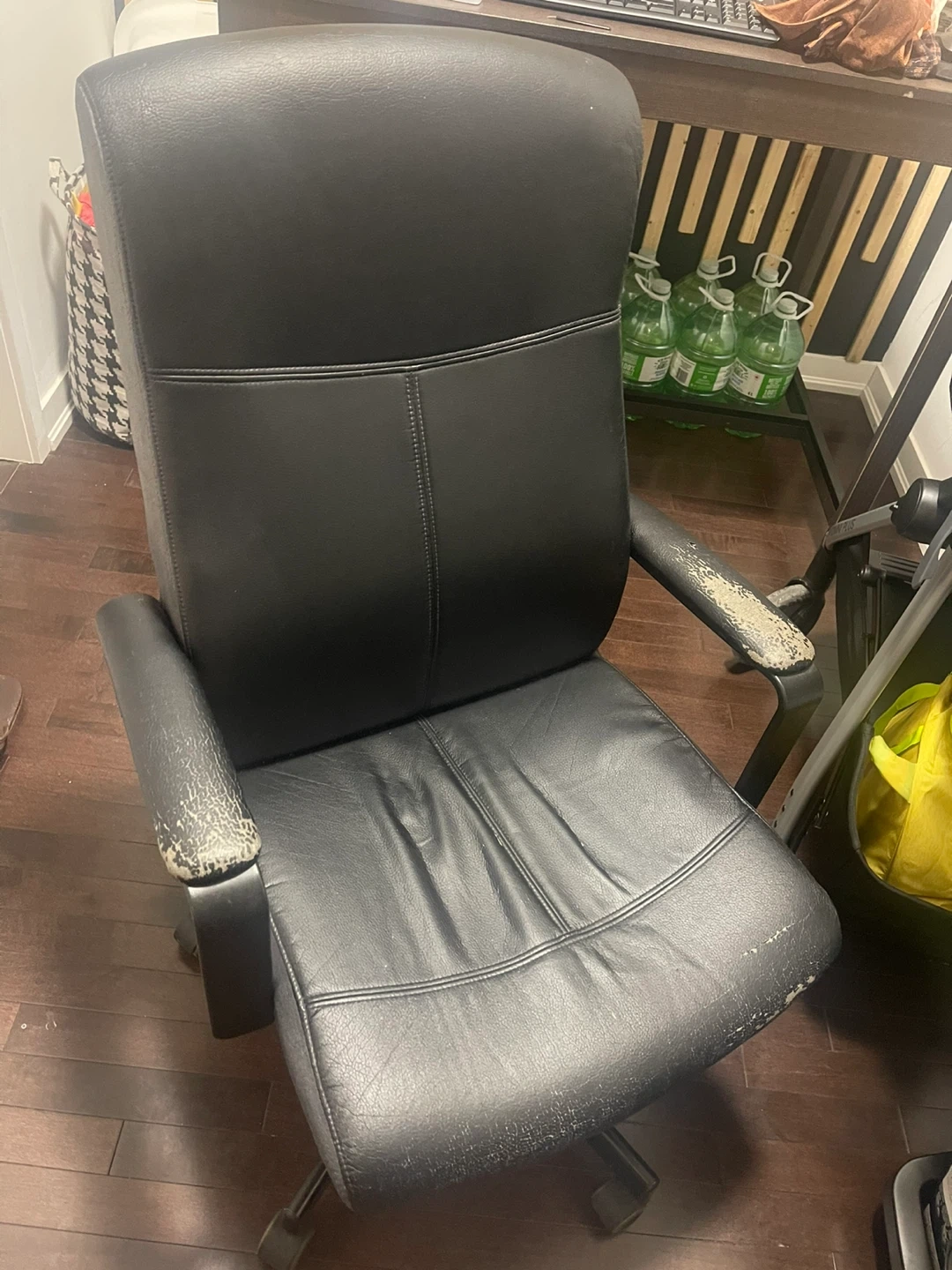Selling a black office chair that's seen better days. As you can see in the pictures, the armrests have some wear and tear, and there are some scuffs on the seat. Still functions as it should, though!